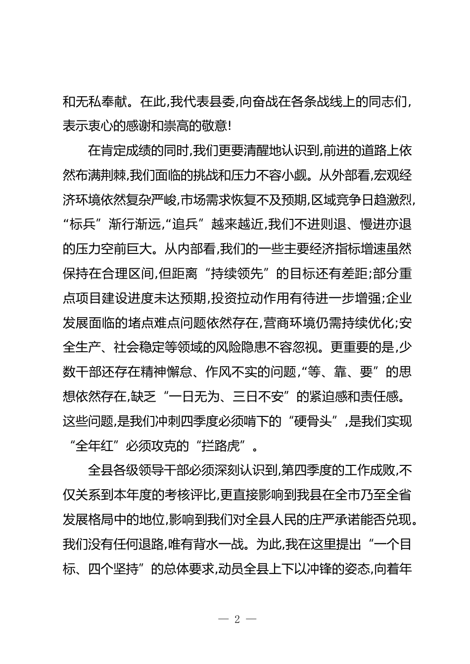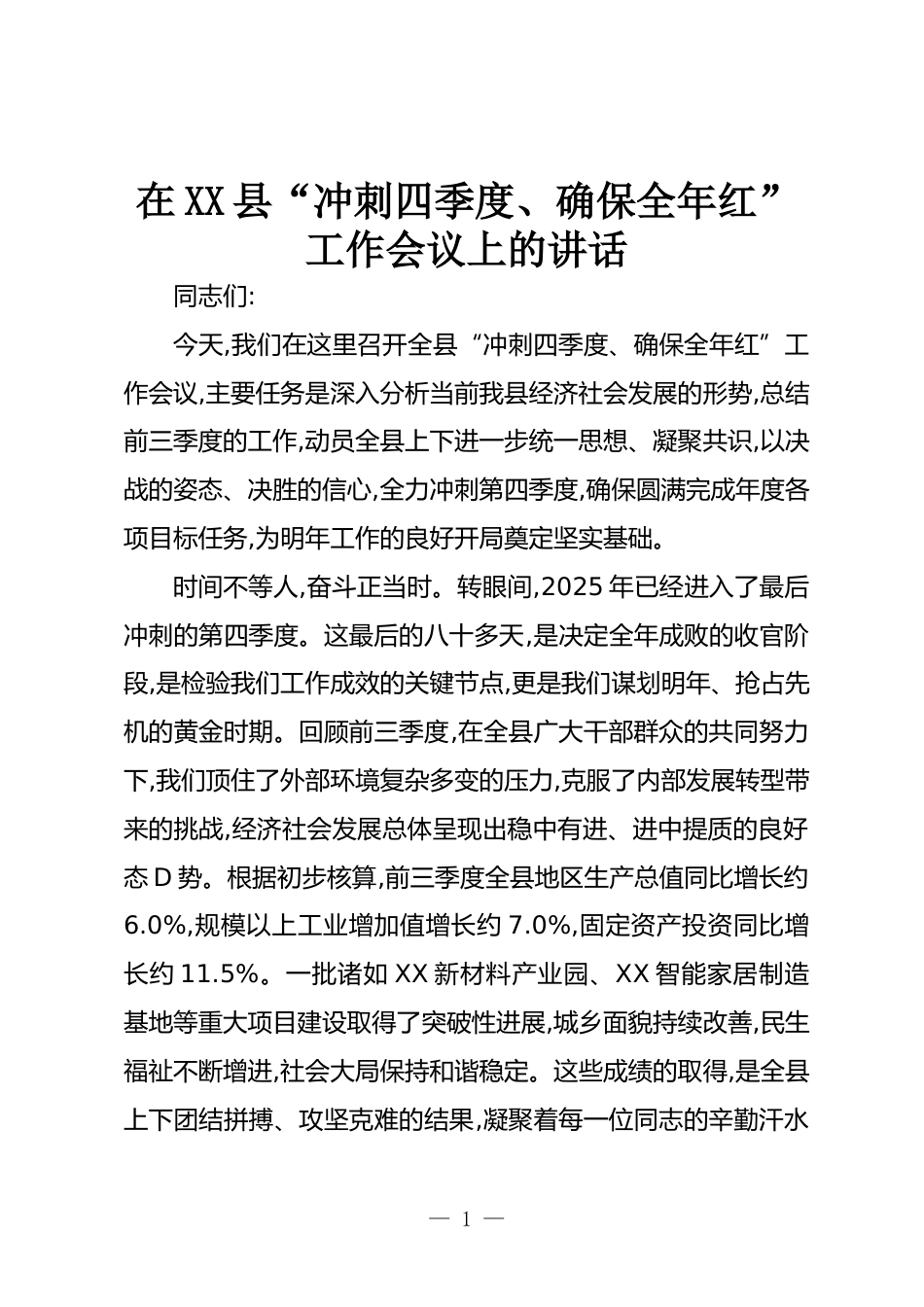 在XX縣“沖刺四季度、確保全年紅”工作會(huì)議上的講話同志們:今天,我們?cè)谶@里召開全縣“沖刺四季度、確保全年紅”工作會(huì)議,主要任務(wù)是深入分析當(dāng)前我縣經(jīng)濟(jì)社會(huì)發(fā)展的形勢(shì),總結(jié)前三季度的工作,動(dòng)員全縣上下進(jìn)一步統(tǒng)一思想、凝聚共識(shí),以決戰(zhàn)的姿態(tài)、決勝的信心,全力沖刺第四季度,確保圓滿完成年度各項(xiàng)目標(biāo)任務(wù),為明年工作的良好開局奠定堅(jiān)實(shí)基礎(chǔ)。時(shí)間不等人,奮斗正當(dāng)時(shí)。轉(zhuǎn)眼間,2025年已經(jīng)進(jìn)入了最后沖刺的第四季度。這最后的八十多天,是決定全年成敗的收官階段,是檢驗(yàn)我們工作成效的關(guān)鍵節(jié)點(diǎn),更是我們謀劃明年、搶占先機(jī)的黃金時(shí)期?;仡櫱叭径?在全縣廣大干部群眾的共...