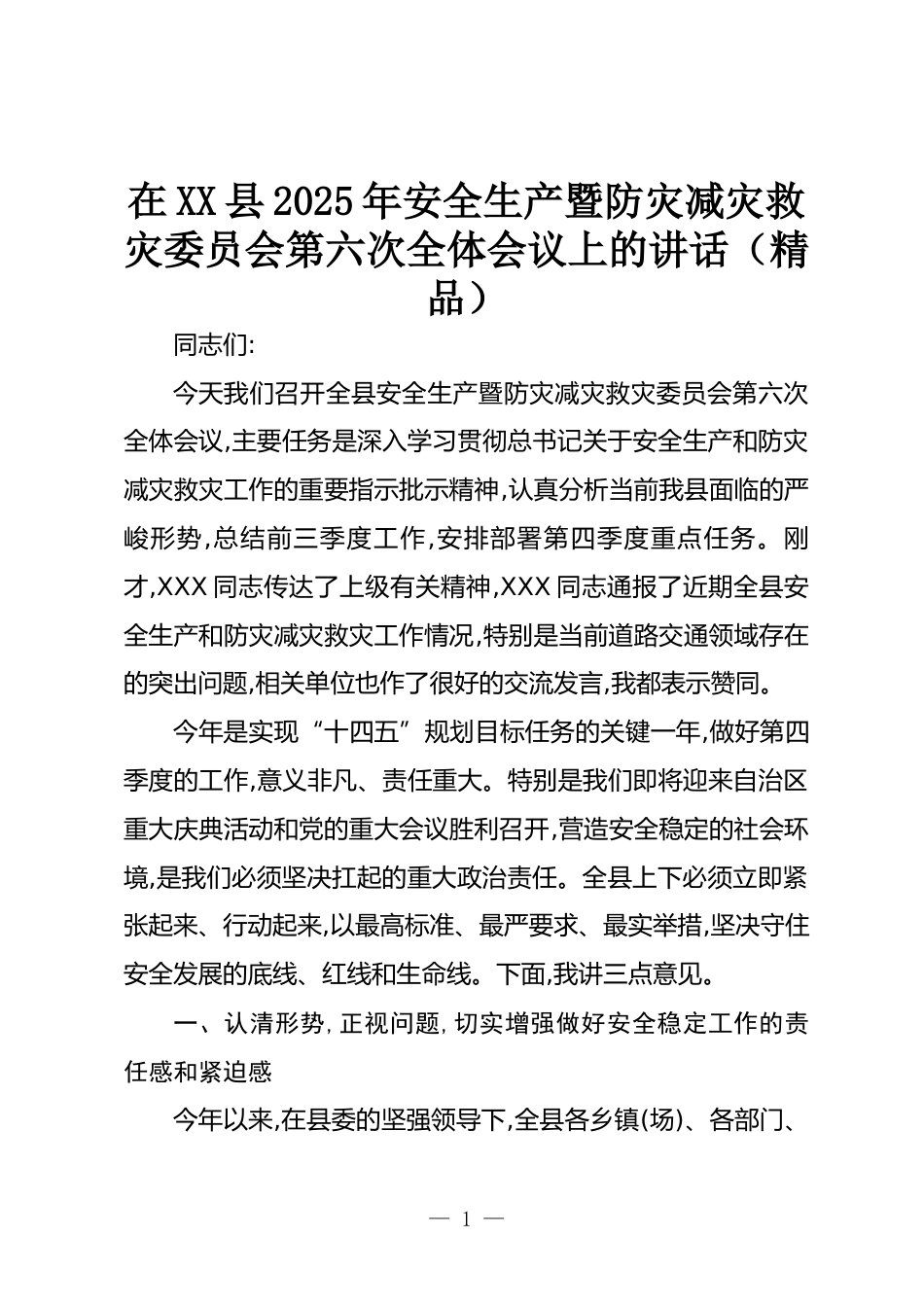 在XX縣2025年安全生產(chǎn)暨防災減災救災委員會第六次全體會議上的講話(精品)