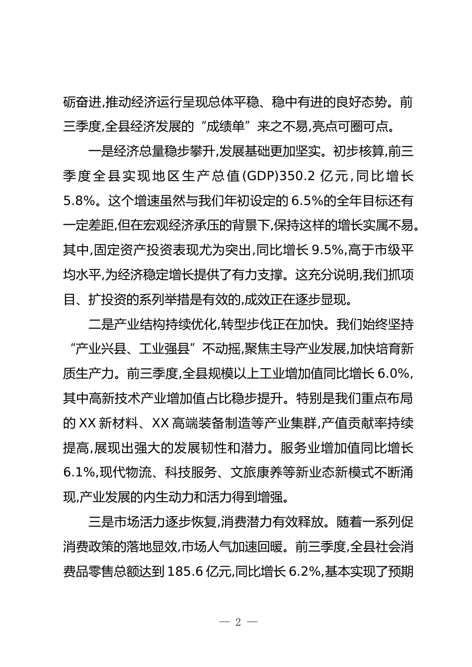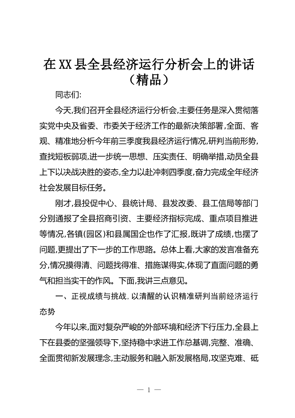 在XX縣全縣經(jīng)濟(jì)運(yùn)行分析會(huì)上的講話(精品)同志們:今天,我們召開全縣經(jīng)濟(jì)運(yùn)行分析會(huì),主要任務(wù)是深入貫徹落實(shí)黨中央及省委、市委關(guān)于經(jīng)濟(jì)工作的最新決策部署,全面、客觀、精準(zhǔn)地分析今年前三季度我縣經(jīng)濟(jì)運(yùn)行情況,研判當(dāng)前形勢(shì),查找短板弱項(xiàng),進(jìn)一步統(tǒng)一思想、壓實(shí)責(zé)任、明確舉措,動(dòng)員全縣上下以決戰(zhàn)決勝的姿態(tài),全力以赴沖刺四季度,奮力完成全年經(jīng)濟(jì)社會(huì)發(fā)展目標(biāo)任務(wù)。剛才,縣投促中心、縣統(tǒng)計(jì)局、縣發(fā)改委、縣工信局等部門分別通報(bào)了全縣招商引資、主要經(jīng)濟(jì)指標(biāo)完成、重點(diǎn)項(xiàng)目推進(jìn)等情況,各鎮(zhèn)(園區(qū))和縣屬國(guó)企也作了匯報(bào),既講了成績(jī),也擺了問題,更提出了下一步的工作思路...