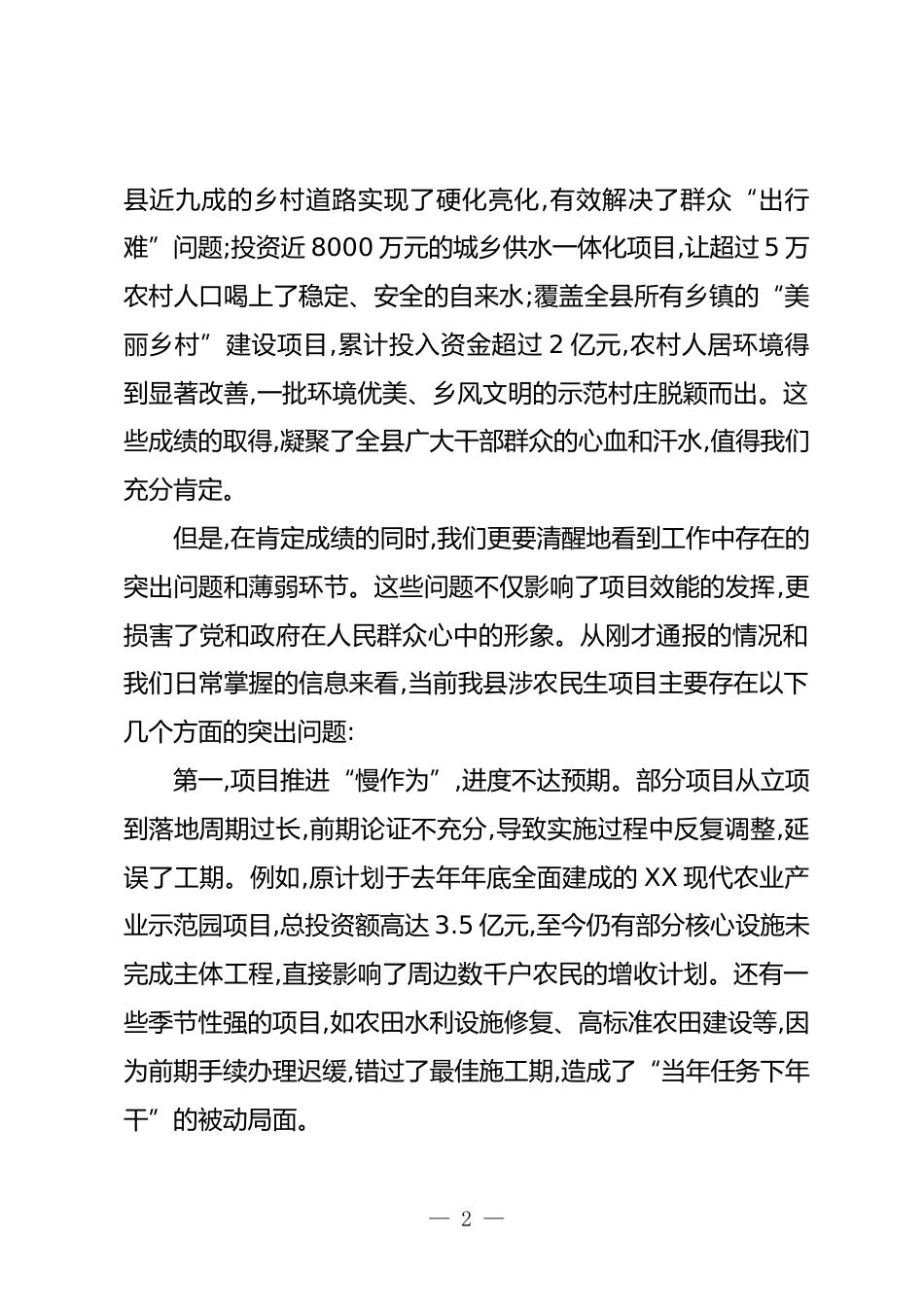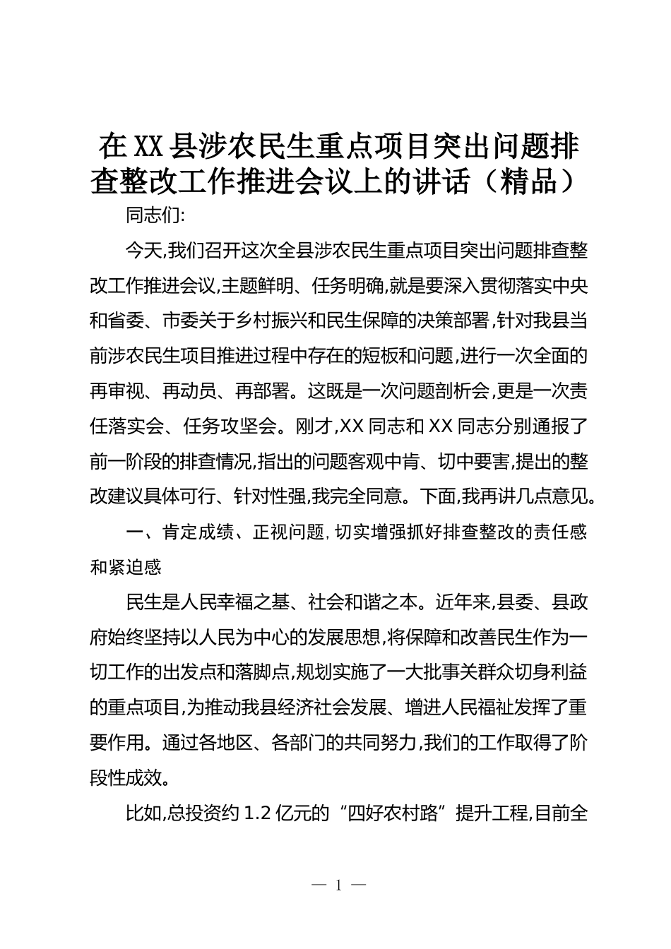 在XX縣涉農(nóng)民生重點(diǎn)項(xiàng)目突出問題排查整改工作推進(jìn)會議上的講話(精品)