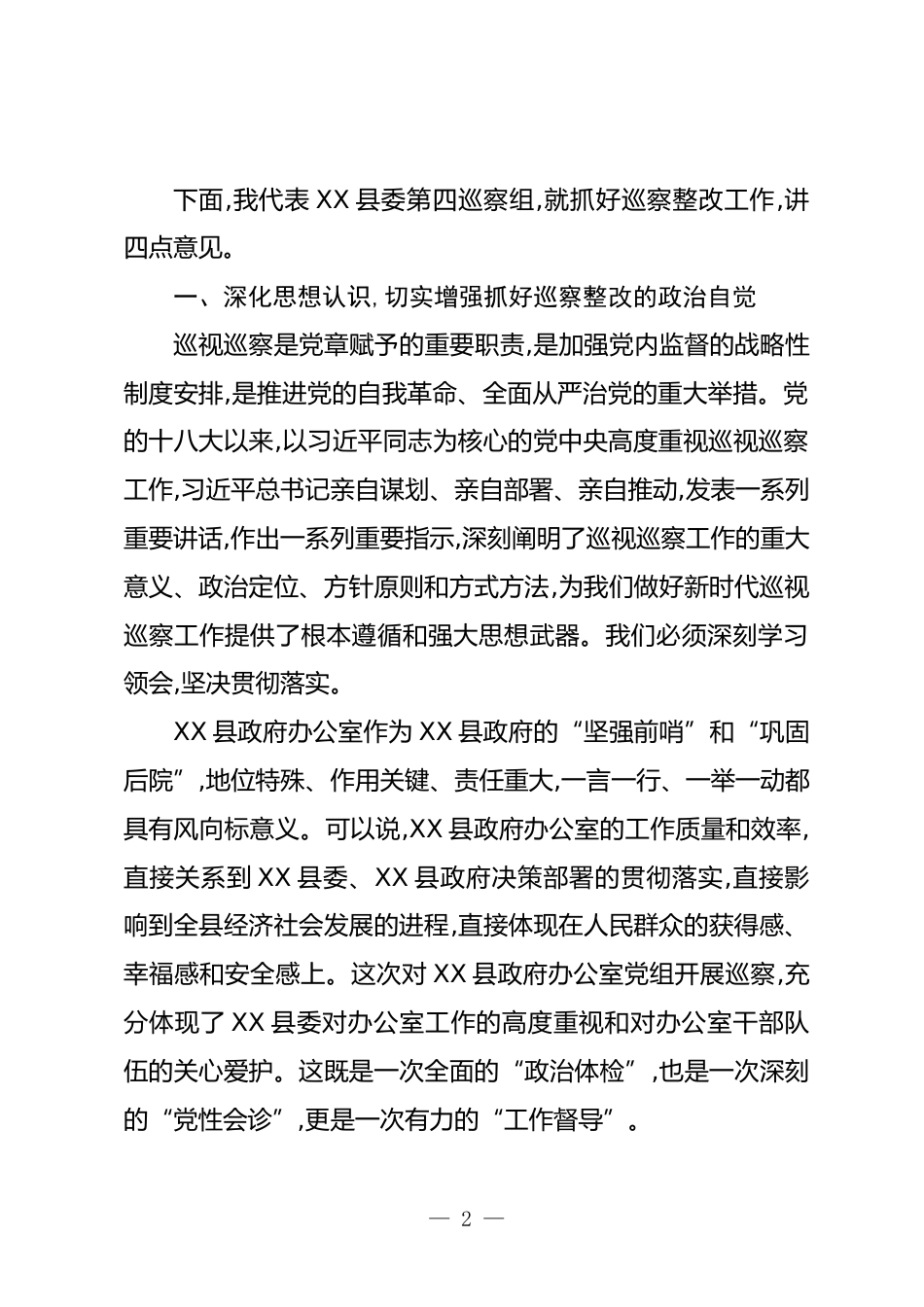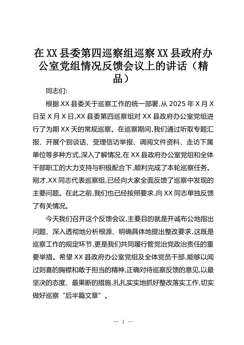 在XX縣委第四巡察組巡察XX縣政府辦公室黨組情況反饋會議上的講話(精品)