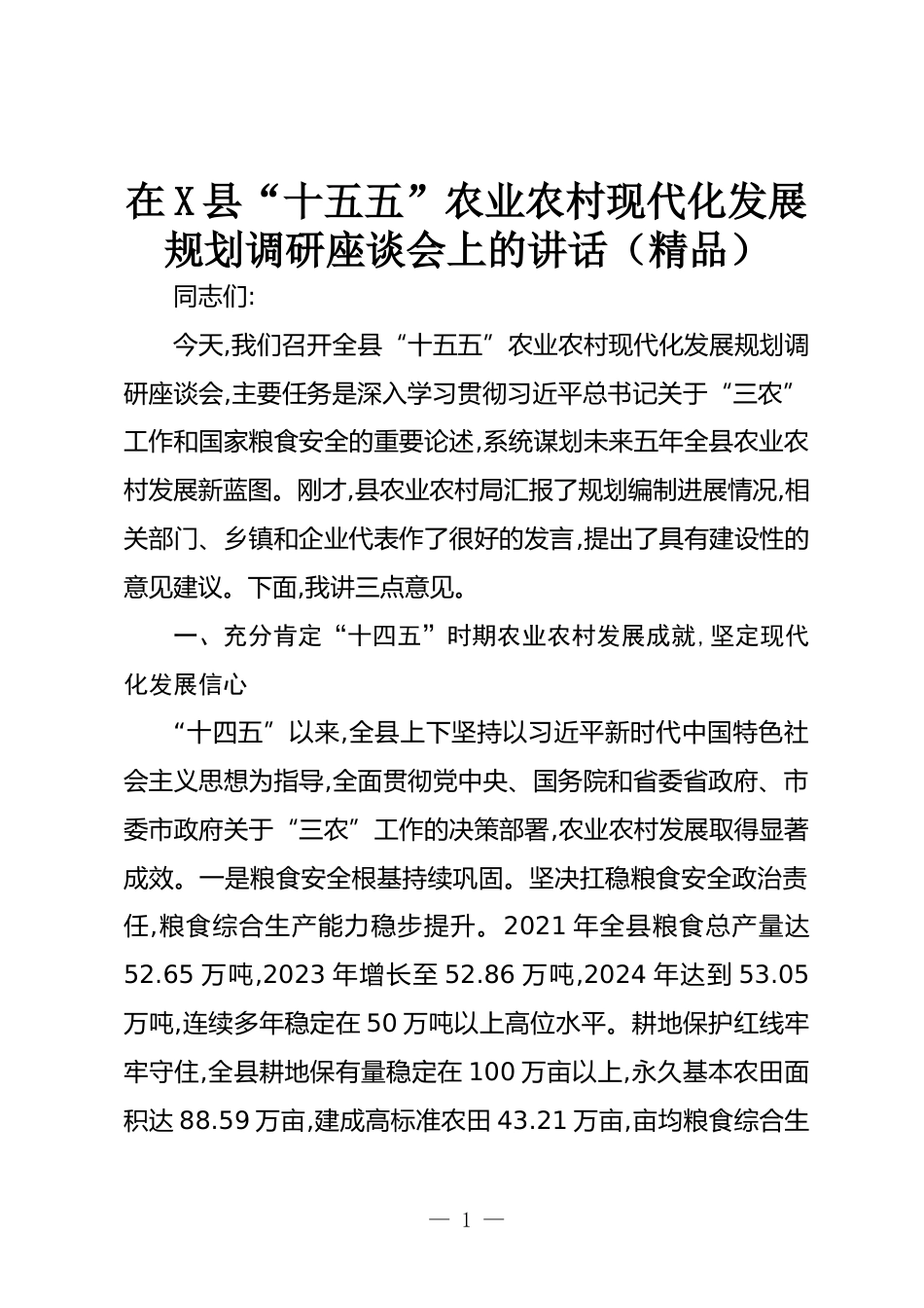 在X縣“十五五”農(nóng)業(yè)農(nóng)村現(xiàn)代化發(fā)展規(guī)劃調(diào)研座談會(huì)上的講話(精品)