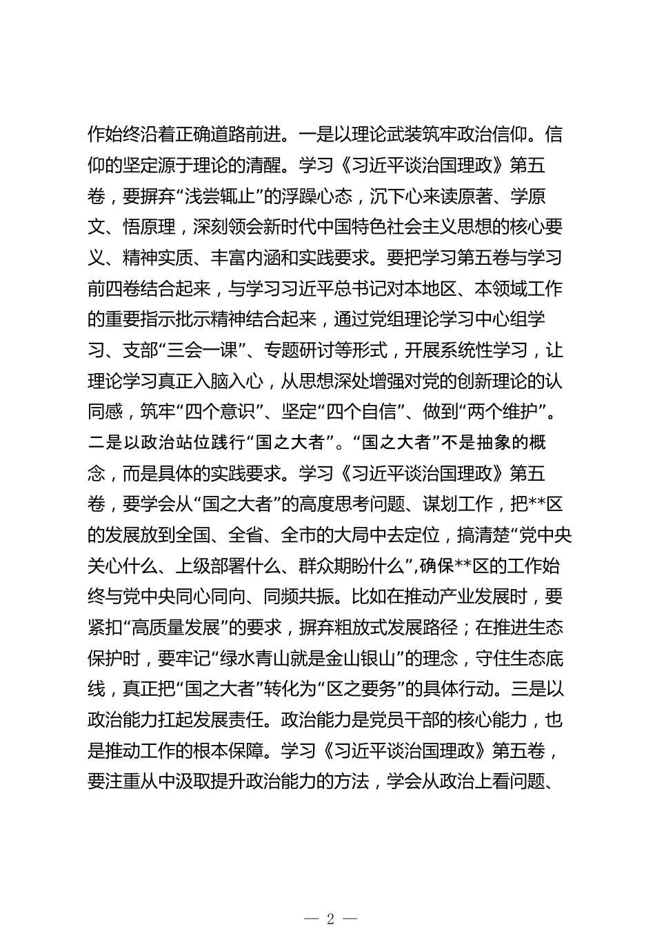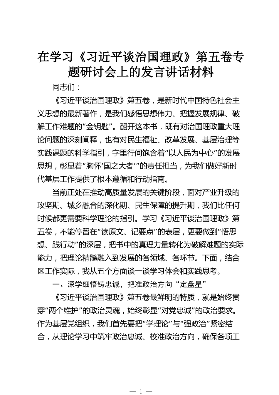 在學(xué)習(xí)《習(xí)近平談治國理政》第五卷專題研討會上的發(fā)言講話材料同志們:《習(xí)近平談治國理政》第五卷,是新時(shí)代中國特色社會主義思想的最新著作,是我們感悟思想偉力、把握發(fā)展規(guī)律、破“”解工作難題的金鑰匙。翻開這本書,既有對治國理政重大理論問題的深刻闡釋,也有對民生福祉、改革發(fā)展、基層治理等“”實(shí)踐課題的科學(xué)指引,字里行間飽含著以人民為中心的發(fā)展“‘思想,彰顯著胸懷國之大者’”的責(zé)任擔(dān)當(dāng),為我們做好新時(shí)代基層工作提供了根本遵循和行動指南。當(dāng)前正處在推動高質(zhì)量發(fā)展的關(guān)鍵階段,面對產(chǎn)業(yè)升級的攻堅(jiān)期、城鄉(xiāng)融合的深化期、民生保障的提升期,我們比...