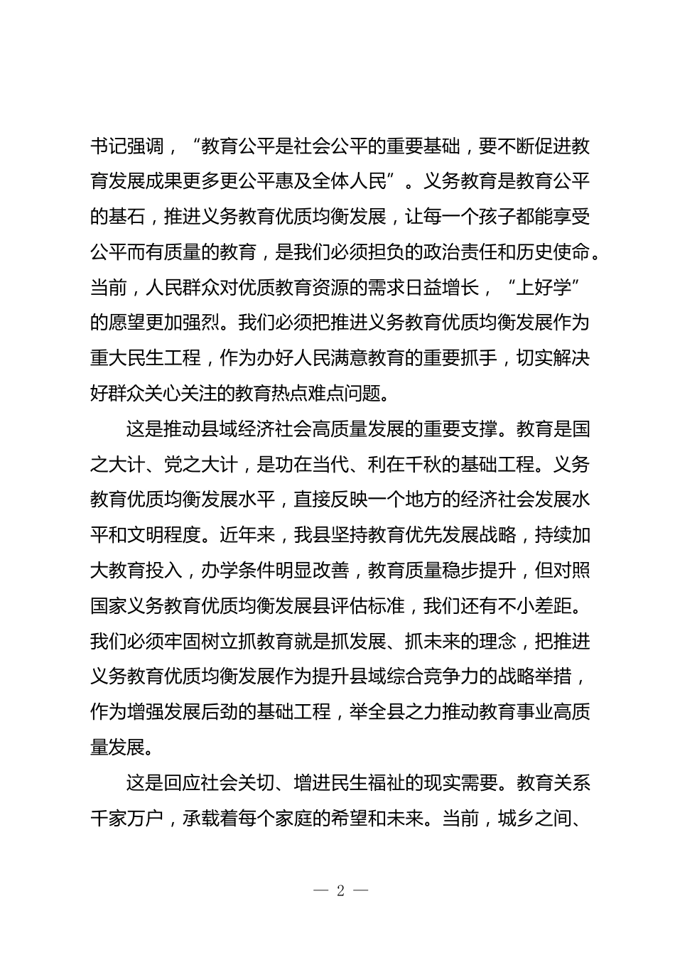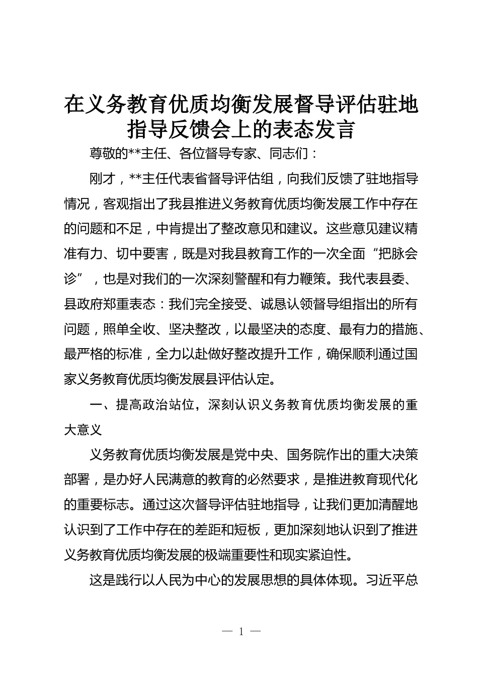 在義務(wù)教育優(yōu)質(zhì)均衡發(fā)展督導(dǎo)評估駐地指導(dǎo)反饋會上的表態(tài)發(fā)言尊敬的**主任、各位督導(dǎo)專家、同志們:剛才,**主任代表省督導(dǎo)評估組,向我們反饋了駐地指導(dǎo)情況,客觀指出了我縣推進(jìn)義務(wù)教育優(yōu)質(zhì)均衡發(fā)展工作中存在的問題和不足,中肯提出了整改意見和建議。這些意見建議精準(zhǔn)有力、切中要害,既是對我縣教育工作的一次全面“把脈會診”,也是對我們的一次深刻警醒和有力鞭策。我代表縣委、縣政府鄭重表態(tài):我們完全接受、誠懇認(rèn)領(lǐng)督導(dǎo)組指出的所有問題,照單全收、堅決整改,以最堅決的態(tài)度、最有力的措施、最嚴(yán)格的標(biāo)準(zhǔn),全力以赴做好整改提升工作,確保順利通過國家義務(wù)教...