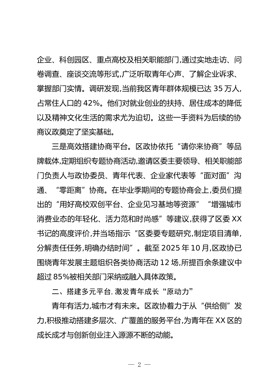 政協(xié)履職服務(wù)青年發(fā)展型城區(qū)建設(shè)工作報告(精品)為深入貫徹落實區(qū)委關(guān)于加快推進青年發(fā)展型城區(qū)建設(shè)的戰(zhàn)略部署,區(qū)政協(xié)充分發(fā)揮專門協(xié)商機構(gòu)作用,將“促進青年與城市共同發(fā)展”作為履職重點,通過深入調(diào)研、精準(zhǔn)建言、民主監(jiān)督,廣泛凝聚各方智慧與力量,為將我區(qū)打造成為青年人才向往、扎根、圓夢的沃土貢獻了政協(xié)力量。現(xiàn)將有關(guān)工作情況報告如下。一、聚焦頂層設(shè)計,凝聚青年發(fā)展“向心力”建設(shè)青年發(fā)展型城區(qū),規(guī)劃先行是基礎(chǔ),凝聚共識是關(guān)鍵。區(qū)政協(xié)始終與區(qū)委、區(qū)政府同頻共振,以高效能履職助推頂層設(shè)計不斷完善,為青年發(fā)展提供堅實的政策保障與社會氛圍。一是主動融入中...