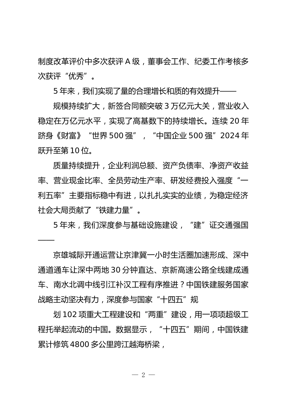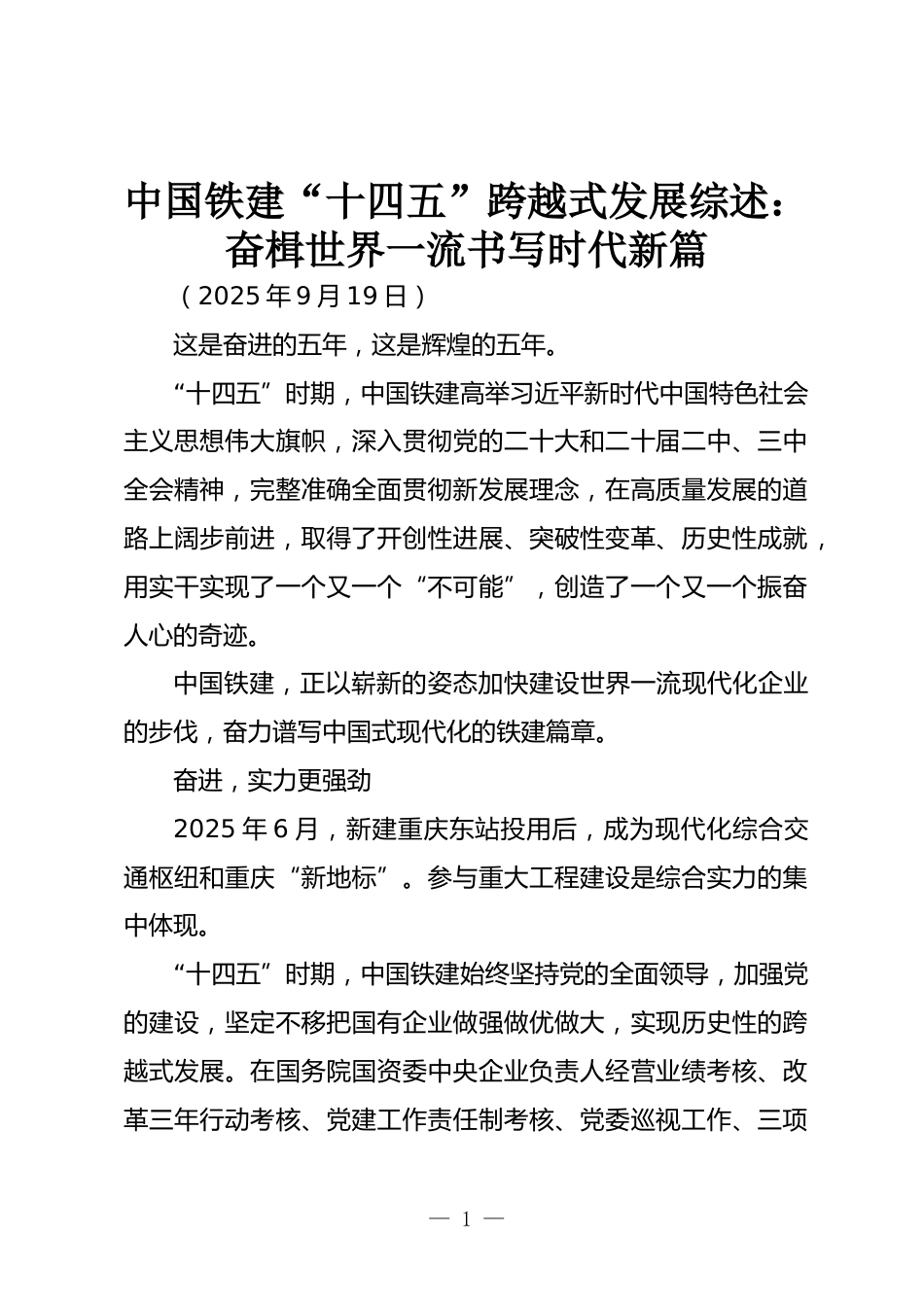 中國鐵建“十四五”跨越式發(fā)展綜述:奮楫世界一流書寫時代新篇(2025年9月19日)這是奮進的五年,這是輝煌的五年?!笆奈濉睍r期,中國鐵建高舉習(xí)近平新時代中國特色社會主義思想偉大旗幟,深入貫徹黨的二十大和二十屆二中、三中全會精神,完整準確全面貫徹新發(fā)展理念,在高質(zhì)量發(fā)展的道路上闊步前進,取得了開創(chuàng)性進展、突破性變革、歷史性成就,用實干實現(xiàn)了一個又一個“不可能”,創(chuàng)造了一個又一個振奮人心的奇跡。中國鐵建,正以嶄新的姿態(tài)加快建設(shè)世界一流現(xiàn)代化企業(yè)的步伐,奮力譜寫中國式現(xiàn)代化的鐵建篇章。奮進,實力更強勁2025年6月,新建重慶東站投用后,成為...