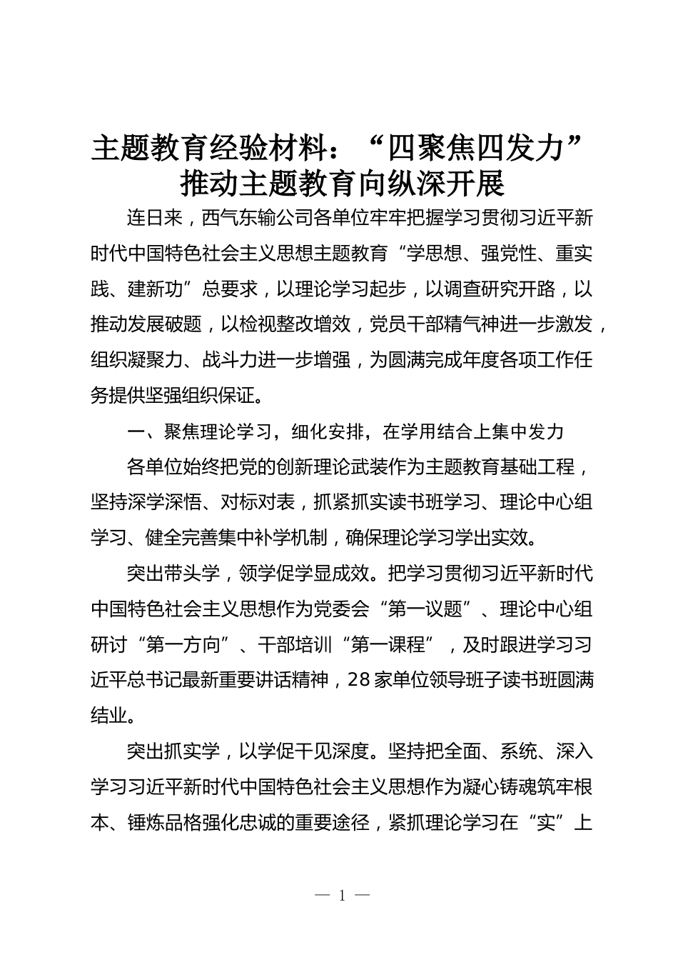 主題教育經(jīng)驗材料:“四聚焦四發(fā)力”推動主題教育向縱深開展連日來,西氣東輸公司各單位牢牢把握學(xué)習(xí)貫徹習(xí)近平新時代中國特色社會主義思想主題教育“學(xué)思想、強黨性、重實踐、建新功”總要求,以理論學(xué)習(xí)起步,以調(diào)查研究開路,以推動發(fā)展破題,以檢視整改增效,黨員干部精氣神進一步激發(fā),組織凝聚力、戰(zhàn)斗力進一步增強,為圓滿完成年度各項工作任務(wù)提供堅強組織保證。一、聚焦理論學(xué)習(xí),細化安排,在學(xué)用結(jié)合上集中發(fā)力各單位始終把黨的創(chuàng)新理論武裝作為主題教育基礎(chǔ)工程,堅持深學(xué)深悟、對標對表,抓緊抓實讀書班學(xué)習(xí)、理論中心組學(xué)習(xí)、健全完善集中補學(xué)機制,確保理...