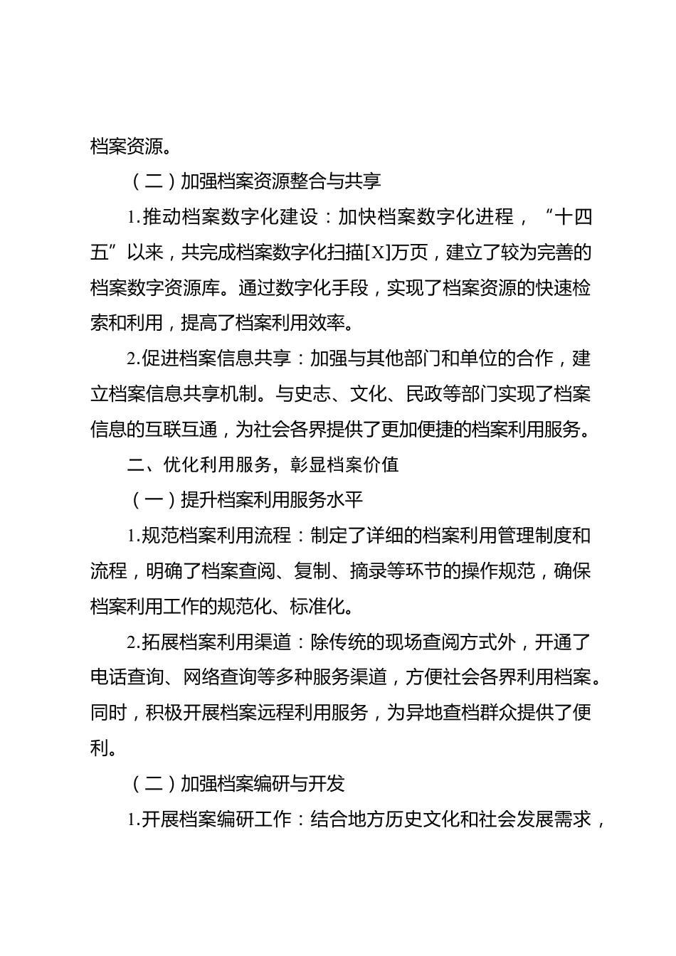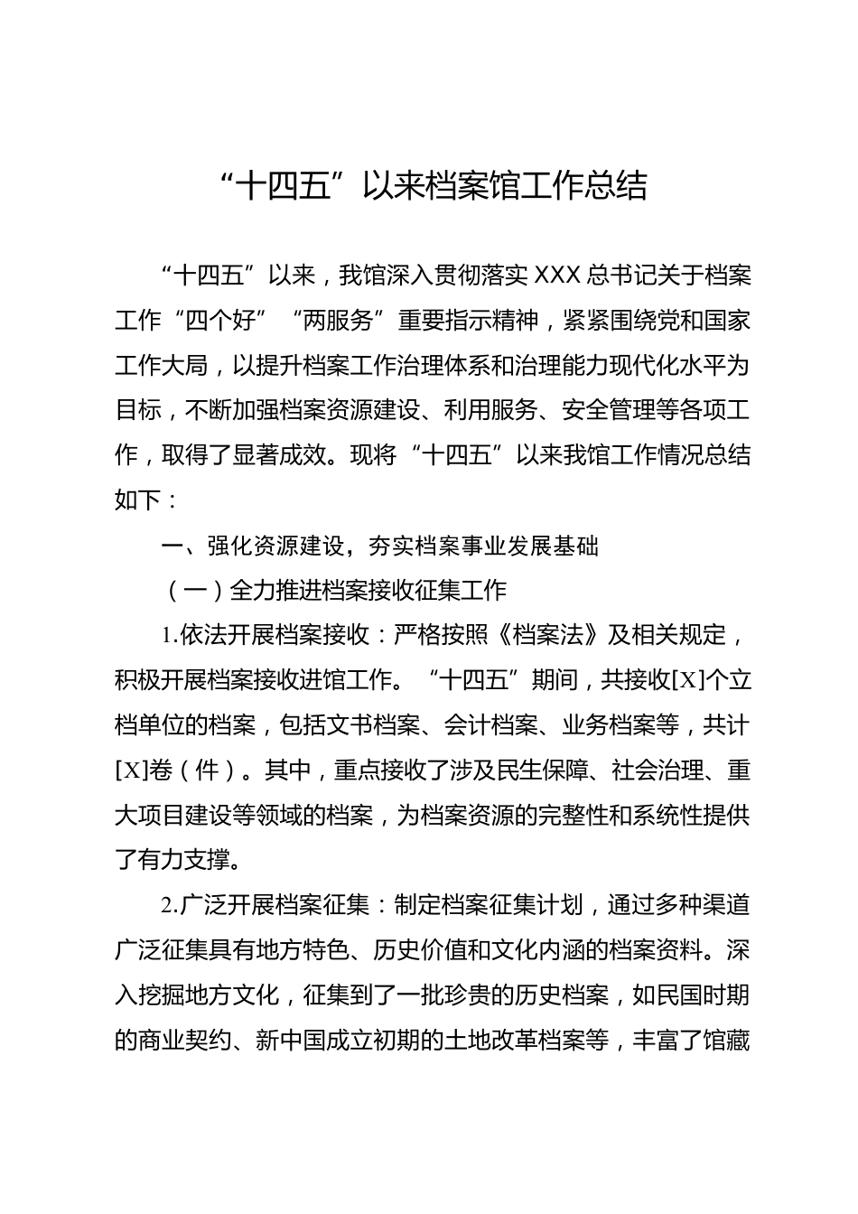 “十四五”以來(lái)檔案館工作總結(jié)“十四五”以來(lái),我館深入貫徹落實(shí)XXX總書(shū)記關(guān)于檔案工作“四個(gè)好”“兩服務(wù)”重要指示精神,緊緊圍繞黨和國(guó)家工作大局,以提升檔案工作治理體系和治理能力現(xiàn)代化水平為目標(biāo),不斷加強(qiáng)檔案資源建設(shè)、利用服務(wù)、安全管理等各項(xiàng)工作,取得了顯著成效?,F(xiàn)將“十四五”以來(lái)我館工作情況總結(jié)如下:一、強(qiáng)化資源建設(shè),夯實(shí)檔案事業(yè)發(fā)展基礎(chǔ)(一)全力推進(jìn)檔案接收征集工作1.依法開(kāi)展檔案接收:嚴(yán)格按照《檔案法》及相關(guān)規(guī)定,積極開(kāi)展檔案接收進(jìn)館工作?!笆奈濉逼陂g,共接收[X]個(gè)立檔單位的檔案,包括文書(shū)檔案、會(huì)計(jì)檔案、業(yè)務(wù)檔案等,共計(jì)[X]...