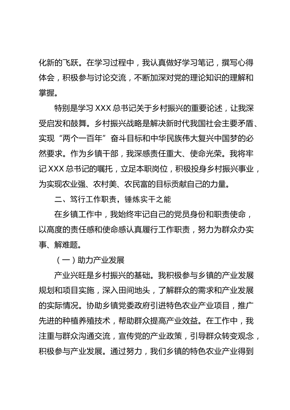 2025年鄉(xiāng)鎮(zhèn)預備黨員入黨思想?yún)R報敬愛的黨組織:自被批準為中共預備黨員以來,在黨組織的悉心關(guān)懷和指導下,在身邊優(yōu)秀黨員同志的熱心幫助下,我時刻以正式黨員的標準嚴格要求自己,不斷在思想、工作、學習和生活等方面努力提升自己?,F(xiàn)將近期的思想、工作和學習情況向黨組織匯報如下。一、深學理論知識,厚植信仰之根作為一名鄉(xiāng)鎮(zhèn)預備黨員,我深刻認識到理論學習是加強黨性修養(yǎng)、堅定理想信念的重要途徑。這段時間,我緊緊圍繞學習貫徹XXX新時代中國特色社會主義思想這一主線,積極參加鄉(xiāng)鎮(zhèn)黨委組織的集中學習,利用業(yè)余時間進行自主學習,認真研讀黨的二十大報告、黨章...