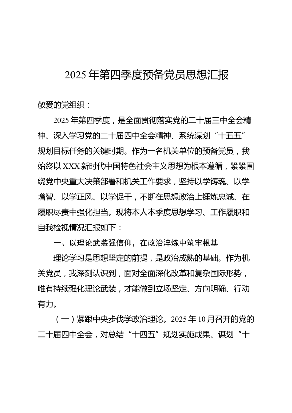 2025年第四季度預(yù)備黨員思想?yún)R報敬愛的黨組織:2025年第四季度,是全面貫徹落實黨的二十屆三中全會精神、深入學(xué)習(xí)黨的二十屆四中全會精神、系統(tǒng)謀劃“十五五”規(guī)劃目標任務(wù)的關(guān)鍵時期。作為一名機關(guān)單位的預(yù)備黨員,我始終以XXX新時代中國特色社會主義思想為根本遵循,緊緊圍繞黨中央重大決策部署和機關(guān)工作要求,堅持以學(xué)鑄魂、以學(xué)增智、以學(xué)正風(fēng)、以學(xué)促干,不斷在思想政治上錘煉忠誠、在履職盡責(zé)中強化擔當?,F(xiàn)將本人本季度思想學(xué)習(xí)、工作履職和自我檢視情況匯報如下:一、以理論武裝強信仰,在政治淬煉中筑牢根基理論學(xué)習(xí)是思想堅定的前提,是政治成熟的基礎(chǔ)。作為...