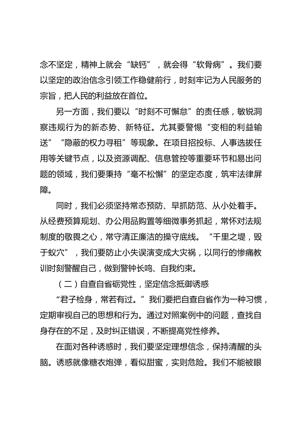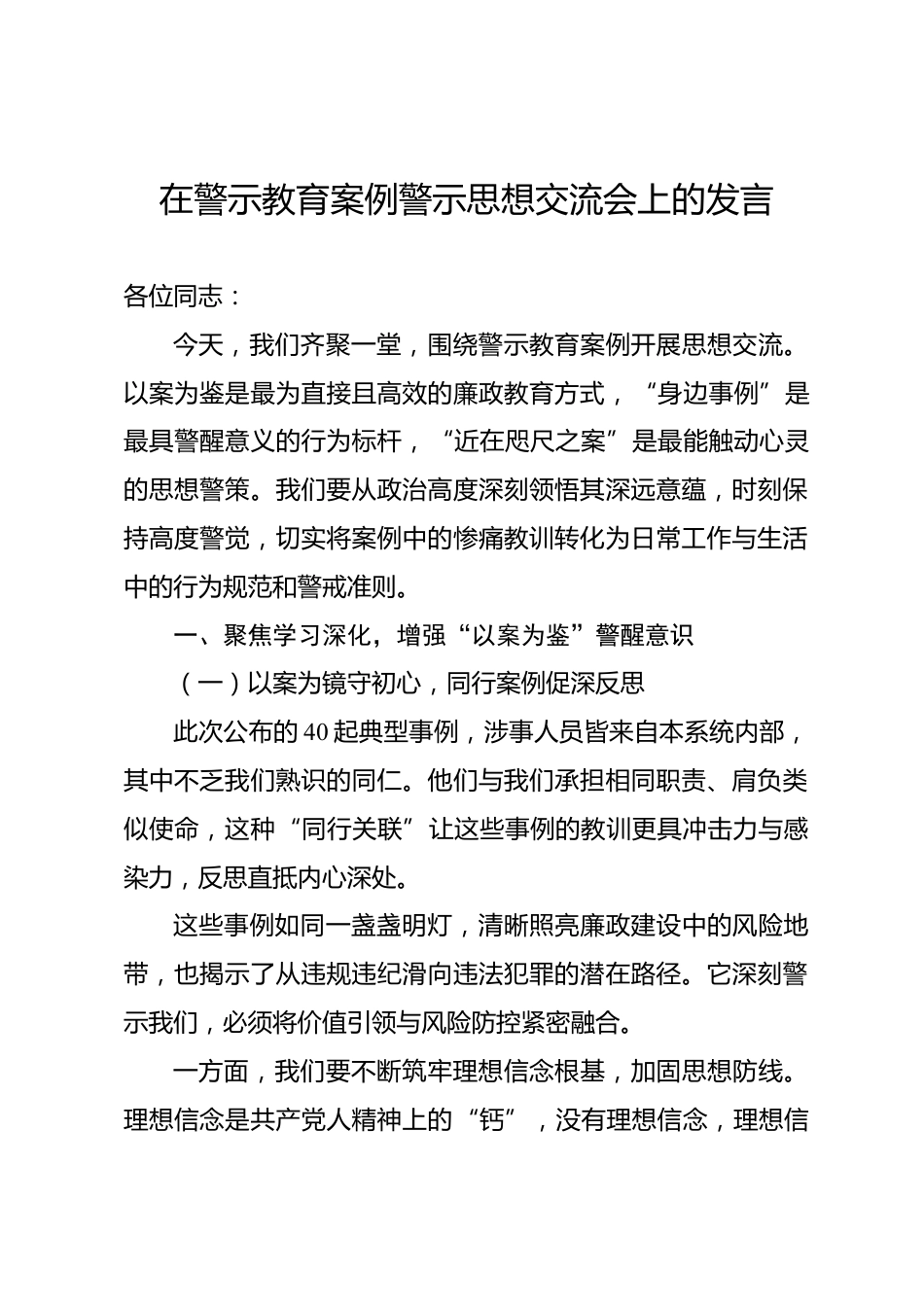 在警示教育案例警示思想交流會上的發(fā)言各位同志:今天,我們齊聚一堂,圍繞警示教育案例開展思想交流。以案為鑒是最為直接且高效的廉政教育方式,“身邊事例”是最具警醒意義的行為標(biāo)桿,“近在咫尺之案”是最能觸動心靈的思想警策。我們要從政治高度深刻領(lǐng)悟其深遠(yuǎn)意蘊(yùn),時刻保持高度警覺,切實(shí)將案例中的慘痛教訓(xùn)轉(zhuǎn)化為日常工作與生活中的行為規(guī)范和警戒準(zhǔn)則。一、聚焦學(xué)習(xí)深化,增強(qiáng)“以案為鑒”警醒意識(一)以案為鏡守初心,同行案例促深反思此次公布的40起典型事例,涉事人員皆來自本系統(tǒng)內(nèi)部,其中不乏我們熟識的同仁。他們與我們承擔(dān)相同職責(zé)、肩負(fù)類似使命,這...