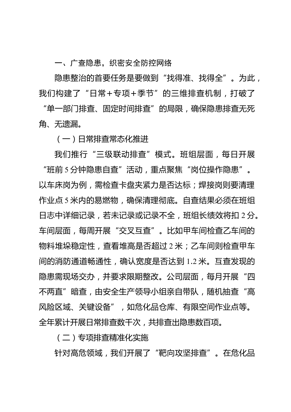 XX國企2025年安全生產(chǎn)年度工作總結(jié)2025年,XX國企緊緊圍繞“十四五”安全生產(chǎn)規(guī)劃收官以及高質(zhì)量發(fā)展的要求,始終把“隱患整治”作為安全生產(chǎn)工作的核心關(guān)鍵,以“零事故、零傷亡”為堅定目標(biāo),嚴(yán)格落實國家安全生產(chǎn)治本攻堅行動部署。在這一年里,企業(yè)直面秋冬設(shè)備凍裂、趕工違規(guī)操作、?;反鎯︼L(fēng)險等諸多挑戰(zhàn),精心構(gòu)建了“排查—整改—鞏固”的全鏈條隱患治理體系。通過全體員工的共同努力,全年累計整治各類隱患數(shù)百項,整改閉環(huán)率達到100%,成功實現(xiàn)安全生產(chǎn)零事故的優(yōu)異成績,為企業(yè)年度生產(chǎn)目標(biāo)的圓滿完成以及“十五五”安全發(fā)展的良好開局奠定了堅實基礎(chǔ)。回顧...