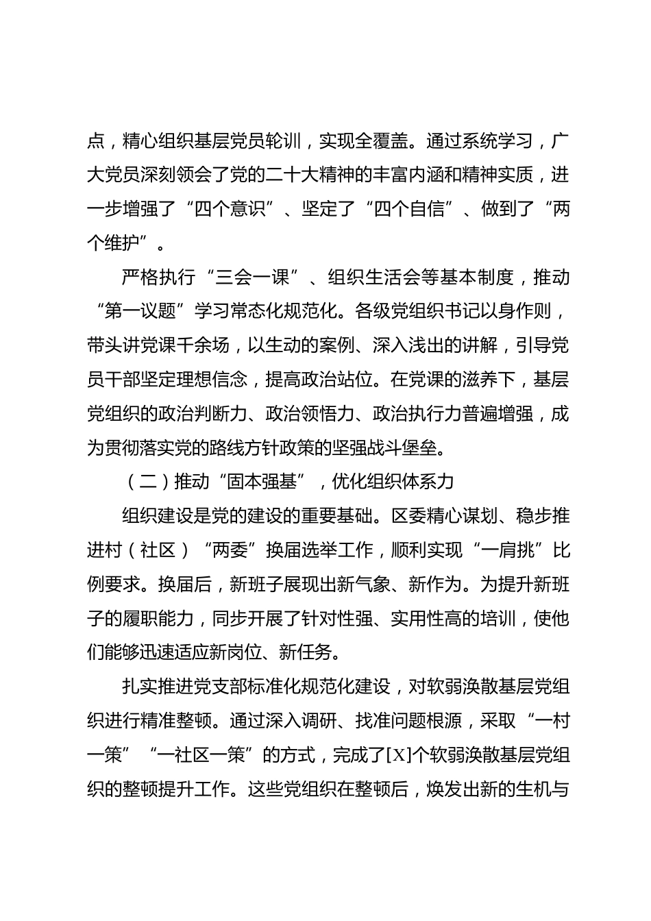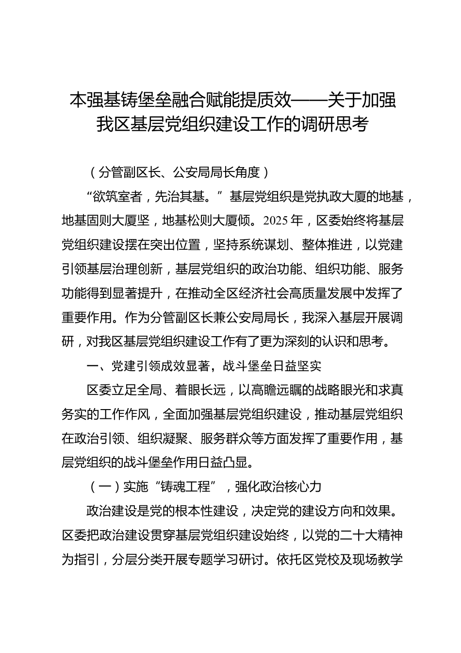 本強基鑄堡壘融合賦能提質(zhì)效——關于加強我區(qū)基層黨組織建設工作的調(diào)研思考(分管副區(qū)長、公安局局長角度)“欲筑室者,先治其基?!被鶎狱h組織是黨執(zhí)政大廈的地基,地基固則大廈堅,地基松則大廈傾。2025年,區(qū)委始終將基層黨組織建設擺在突出位置,堅持系統(tǒng)謀劃、整體推進,以黨建引領基層治理創(chuàng)新,基層黨組織的政治功能、組織功能、服務功能得到顯著提升,在推動全區(qū)經(jīng)濟社會高質(zhì)量發(fā)展中發(fā)揮了重要作用。作為分管副區(qū)長兼公安局局長,我深入基層開展調(diào)研,對我區(qū)基層黨組織建設工作有了更為深刻的認識和思考。一、黨建引領成效顯著,戰(zhàn)斗堡壘日益堅實區(qū)委立足全局、...