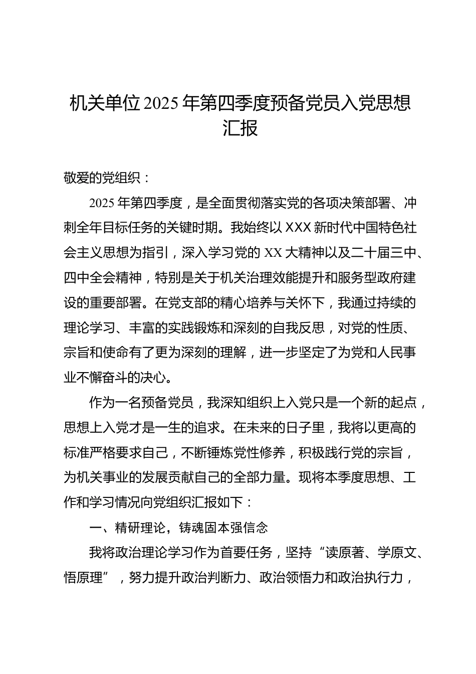 機(jī)關(guān)單位 2025 年第四季度預(yù)備黨員入黨思想?yún)R報(bào)