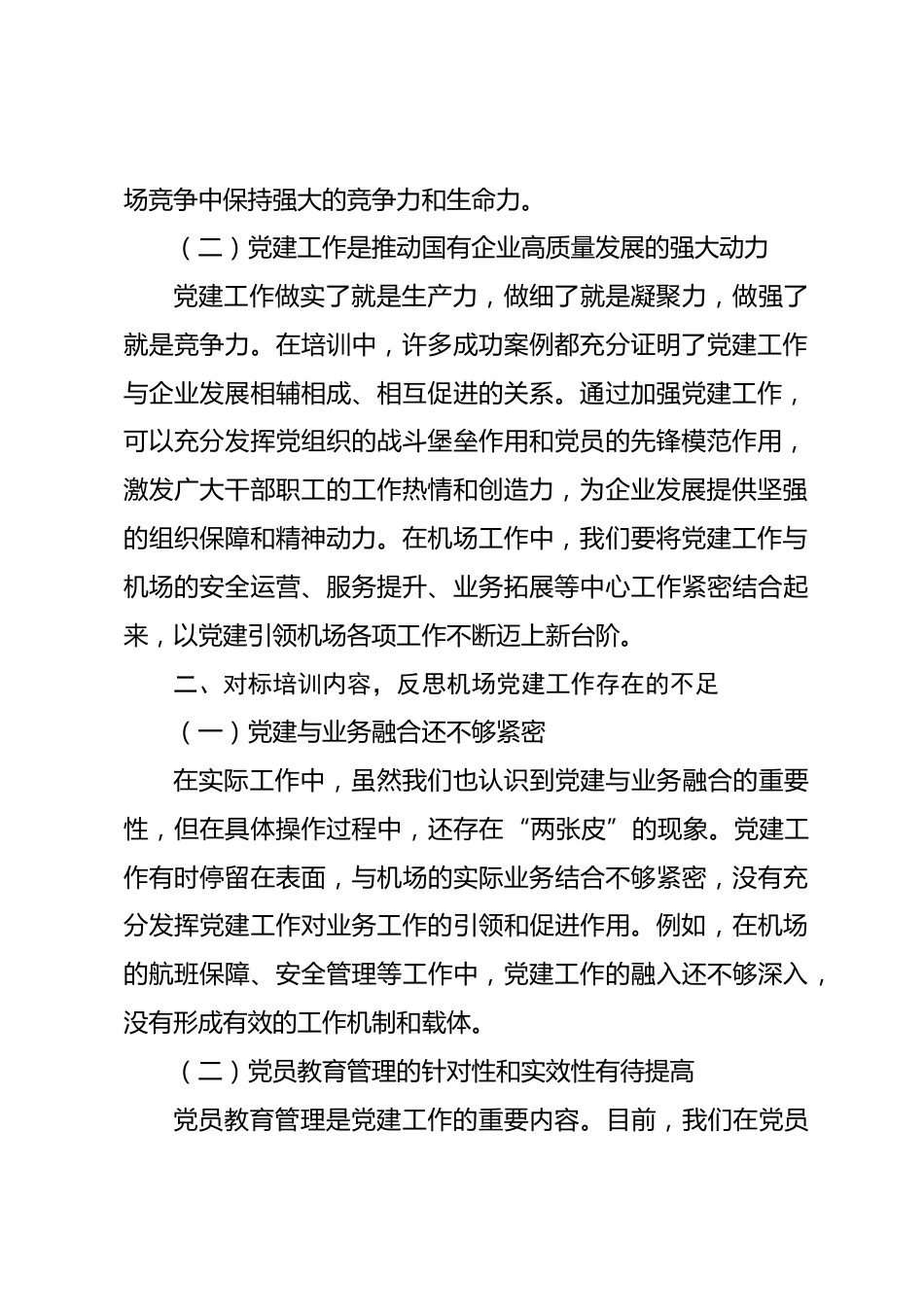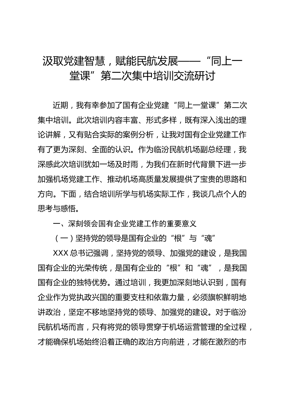 汲取黨建智慧,賦能民航發(fā)展——“同上一堂課”第二次集中培訓交流研討近期,我有幸參加了國有企業(yè)黨建“同上一堂課”第二次集中培訓。此次培訓內容豐富、形式多樣,既有深入淺出的理論講解,又有貼合實際的案例分析,讓我對國有企業(yè)黨建工作有了更為深刻、全面的認識。作為臨汾民航機場副總經理,我深感此次培訓猶如一場及時雨,為我們在新時代背景下進一步加強機場黨建工作、推動機場高質量發(fā)展提供了寶貴的思路和方向。下面,結合培訓所學與機場實際工作,我談幾點個人的思考與感悟。一、深刻領會國有企業(yè)黨建工作的重要意義(一)堅持黨的領導是國有企業(yè)的“根”與“...