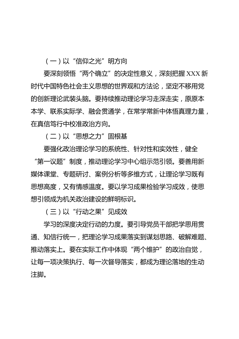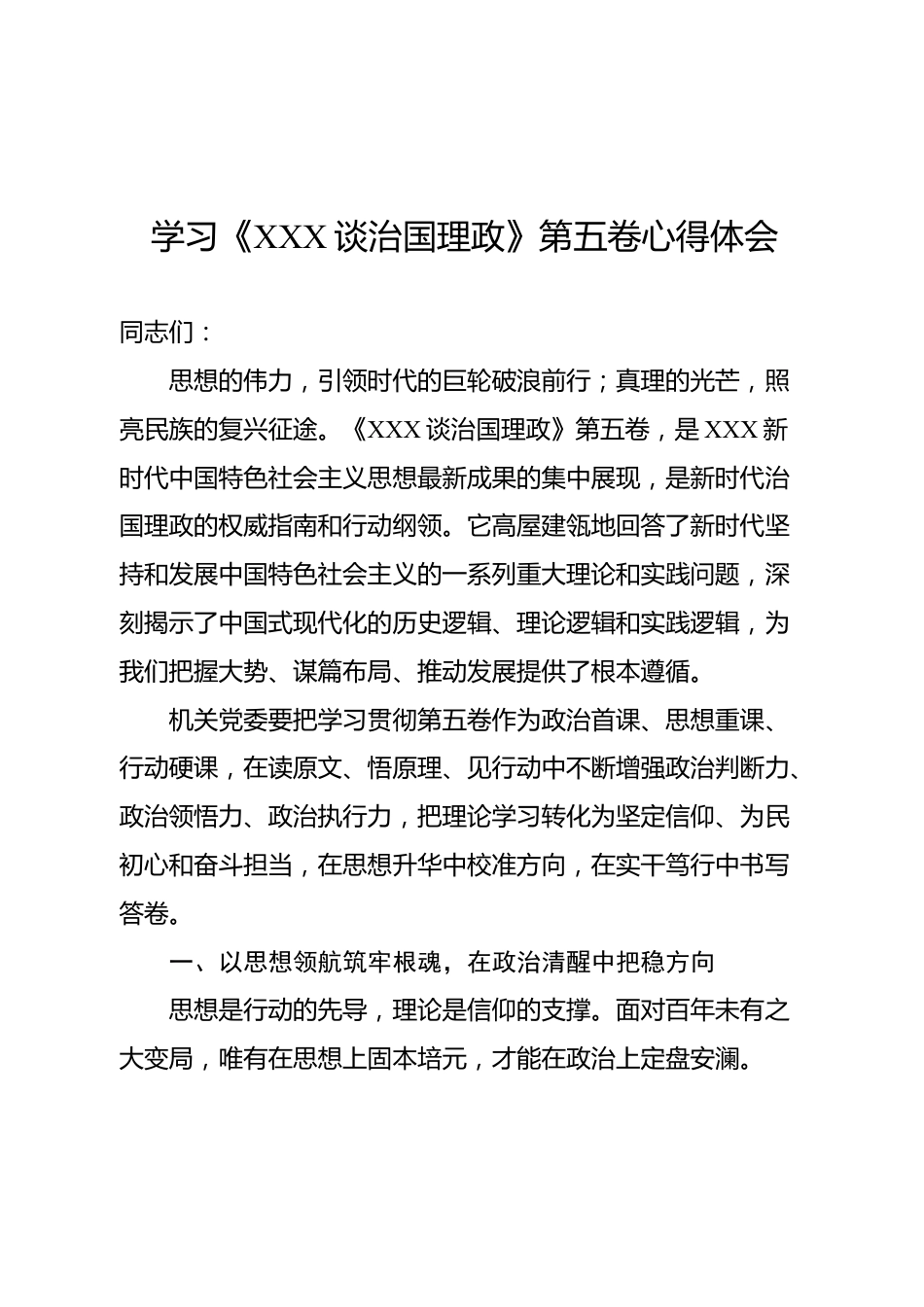 學(xué)習(xí)《XXX談治國理政》第五卷心得體會同志們:思想的偉力,引領(lǐng)時(shí)代的巨輪破浪前行;真理的光芒,照亮民族的復(fù)興征途。《XXX談治國理政》第五卷,是XXX新時(shí)代中國特色社會主義思想最新成果的集中展現(xiàn),是新時(shí)代治國理政的權(quán)威指南和行動綱領(lǐng)。它高屋建瓴地回答了新時(shí)代堅(jiān)持和發(fā)展中國特色社會主義的一系列重大理論和實(shí)踐問題,深刻揭示了中國式現(xiàn)代化的歷史邏輯、理論邏輯和實(shí)踐邏輯,為我們把握大勢、謀篇布局、推動發(fā)展提供了根本遵循。機(jī)關(guān)黨委要把學(xué)習(xí)貫徹第五卷作為政治首課、思想重課、行動硬課,在讀原文、悟原理、見行動中不斷增強(qiáng)政治判斷力、政治領(lǐng)悟力、政治...