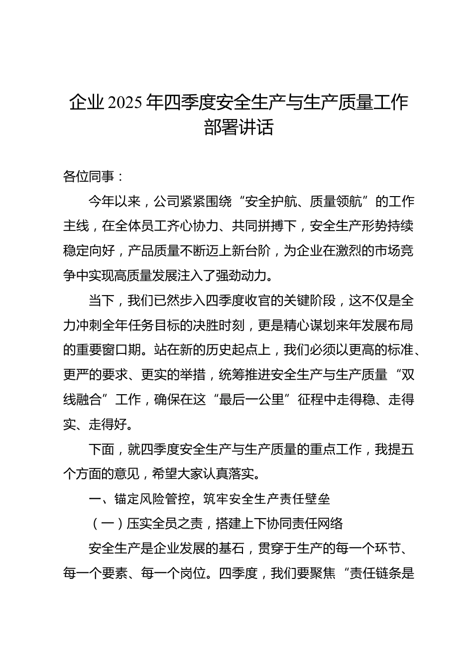 企業(yè) 2025 年四季度安全生產(chǎn)與生產(chǎn)質(zhì)量工作部署講話