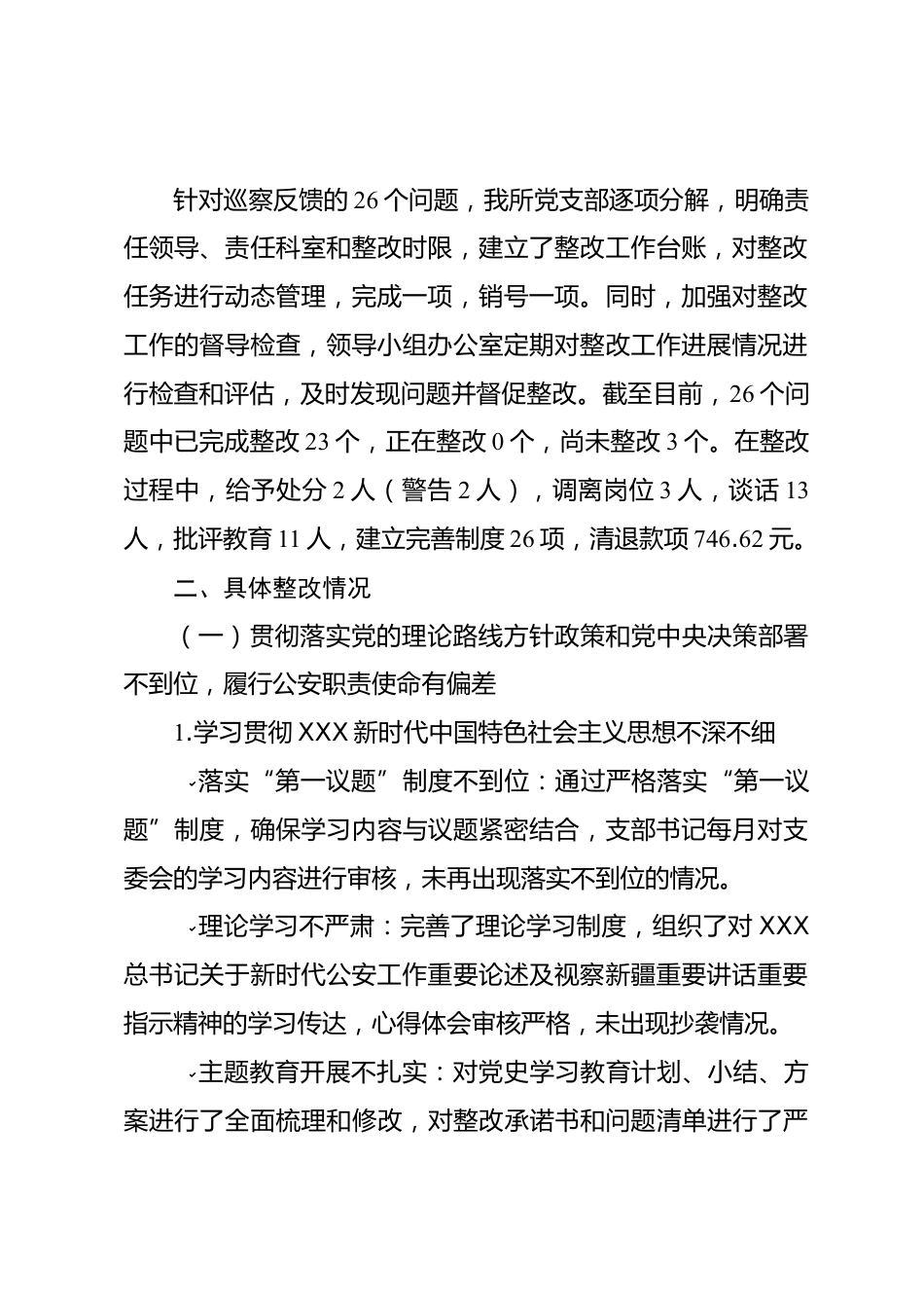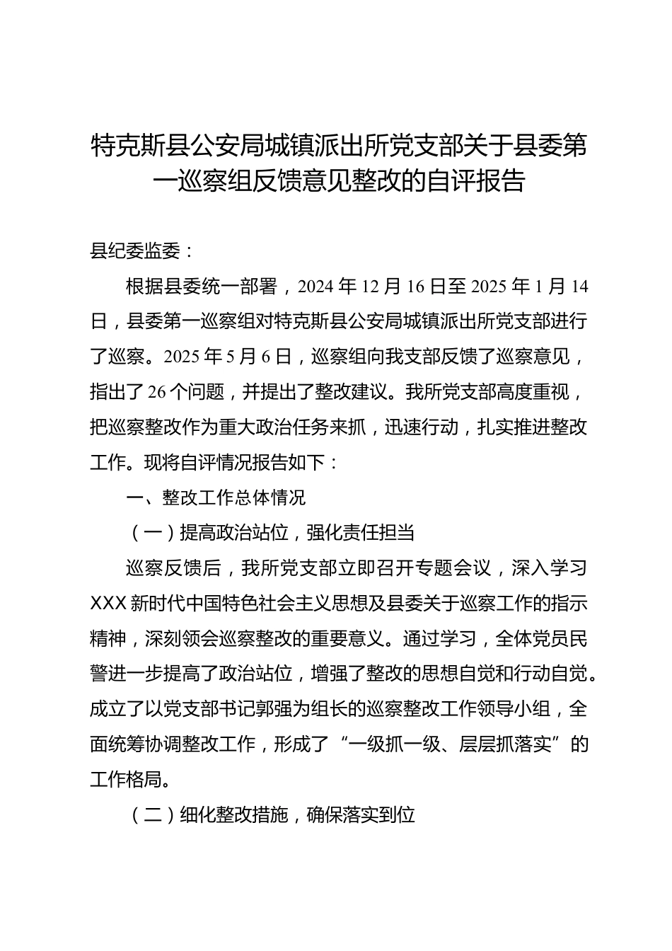 特克斯縣公安局城鎮(zhèn)派出所黨支部關(guān)于縣委第一巡察組反饋意見整改的自評報告縣紀委監(jiān)委:根據(jù)縣委統(tǒng)一部署,2024年12月16日至2025年1月14日,縣委第一巡察組對特克斯縣公安局城鎮(zhèn)派出所黨支部進行了巡察。2025年5月6日,巡察組向我支部反饋了巡察意見,指出了26個問題,并提出了整改建議。我所黨支部高度重視,把巡察整改作為重大政治任務(wù)來抓,迅速行動,扎實推進整改工作?,F(xiàn)將自評情況報告如下:一、整改工作總體情況(一)提高政治站位,強化責任擔當巡察反饋后,我所黨支部立即召開專題會議,深入學習XXX新時代中國特色社會主義思想及縣委關(guān)于巡察工作的指示精神,深...