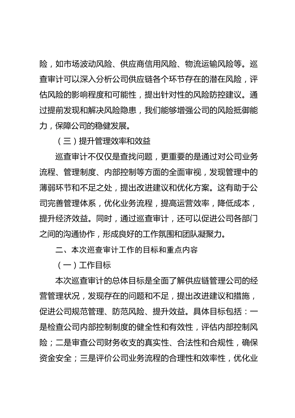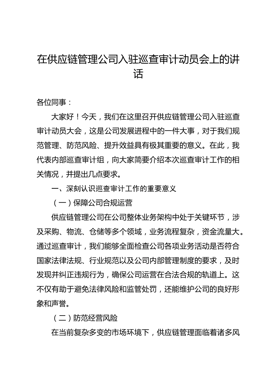 在供應(yīng)鏈管理公司入駐巡查審計(jì)動(dòng)員會(huì)上的講話各位同事:大家好!今天,我們?cè)谶@里召開供應(yīng)鏈管理公司入駐巡查審計(jì)動(dòng)員大會(huì),這是公司發(fā)展進(jìn)程中的一件大事,對(duì)于我們規(guī)范管理、防范風(fēng)險(xiǎn)、提升效益具有極其重要的意義。在此,我代表內(nèi)部巡查審計(jì)組,向大家簡(jiǎn)要介紹本次巡查審計(jì)工作的相關(guān)情況,并提出幾點(diǎn)要求。一、深刻認(rèn)識(shí)巡查審計(jì)工作的重要意義(一)保障公司合規(guī)運(yùn)營供應(yīng)鏈管理公司在公司整體業(yè)務(wù)架構(gòu)中處于關(guān)鍵環(huán)節(jié),涉及采購、物流、倉儲(chǔ)等多個(gè)領(lǐng)域,業(yè)務(wù)流程復(fù)雜,資金流量大。通過巡查審計(jì),我們能夠全面檢查公司各項(xiàng)業(yè)務(wù)活動(dòng)是否符合國家法律法規(guī)、行業(yè)規(guī)范以及...