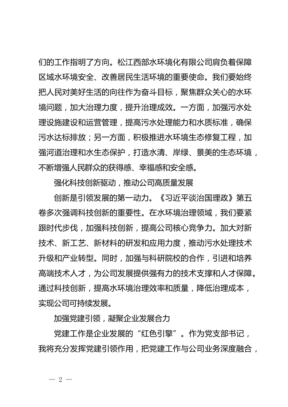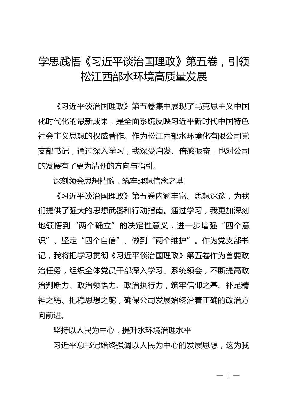 學(xué)思踐悟《習(xí)近平談治國理政》第五卷,引領(lǐng)松江西部水環(huán)境高質(zhì)量發(fā)展《習(xí)近平談治國理政》第五卷集中展現(xiàn)了馬克思主義中國化時代化的最新成果,是全面系統(tǒng)反映習(xí)近平新時代中國特色社會主義思想的權(quán)威著作。作為松江西部水環(huán)境化有限公司黨支部書記,通過深入學(xué)習(xí),我深受啟發(fā)、倍感振奮,也對公司的發(fā)展有了更為清晰的方向與指引。深刻領(lǐng)會思想精髓,筑牢理想信念之基《習(xí)近平談治國理政》第五卷內(nèi)涵豐富、思想深邃,為我們提供了強大的思想武器和行動指南。通過學(xué)習(xí),我更加深刻地領(lǐng)悟到“兩個確立”的決定性意義,進一步增強“四個意識”、堅定“四個自信”、做到“兩...