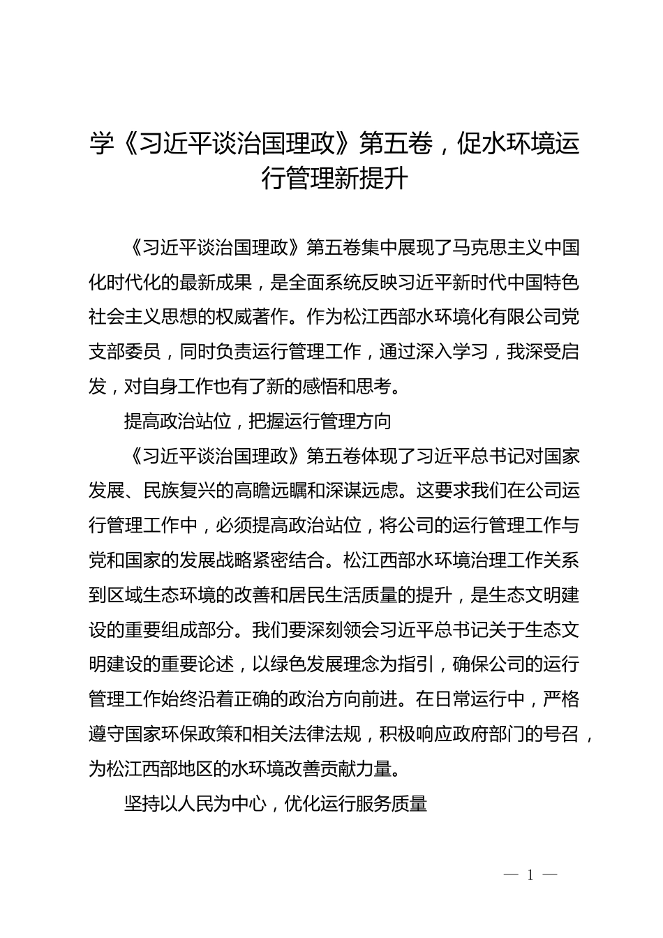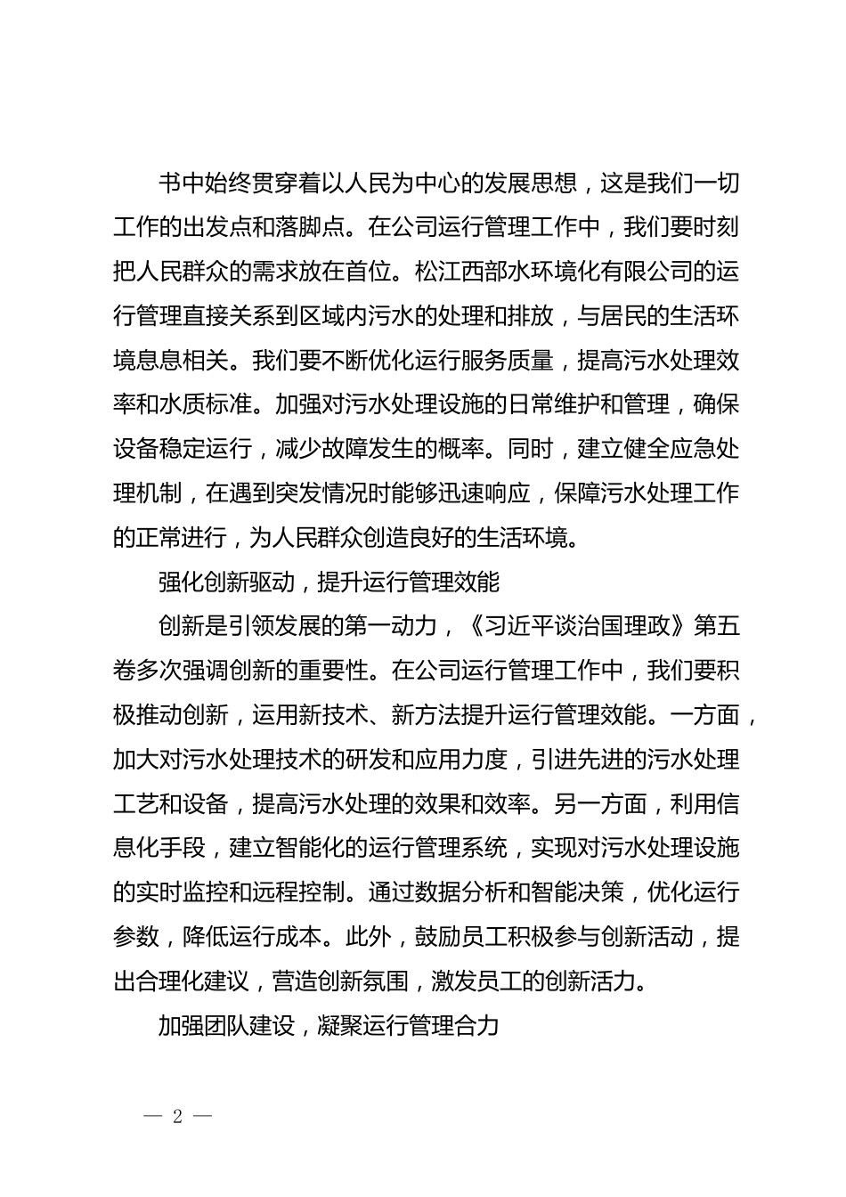 學(xué)《習(xí)近平談治國(guó)理政》第五卷,促水環(huán)境運(yùn)行管理新提升《習(xí)近平談治國(guó)理政》第五卷集中展現(xiàn)了馬克思主義中國(guó)化時(shí)代化的最新成果,是全面系統(tǒng)反映習(xí)近平新時(shí)代中國(guó)特色社會(huì)主義思想的權(quán)威著作。作為松江西部水環(huán)境化有限公司黨支部委員,同時(shí)負(fù)責(zé)運(yùn)行管理工作,通過(guò)深入學(xué)習(xí),我深受啟發(fā),對(duì)自身工作也有了新的感悟和思考。提高政治站位,把握運(yùn)行管理方向《習(xí)近平談治國(guó)理政》第五卷體現(xiàn)了習(xí)近平總書記對(duì)國(guó)家發(fā)展、民族復(fù)興的高瞻遠(yuǎn)矚和深謀遠(yuǎn)慮。這要求我們?cè)诠具\(yùn)行管理工作中,必須提高政治站位,將公司的運(yùn)行管理工作與黨和國(guó)家的發(fā)展戰(zhàn)略緊密結(jié)合。松江西部水環(huán)境...