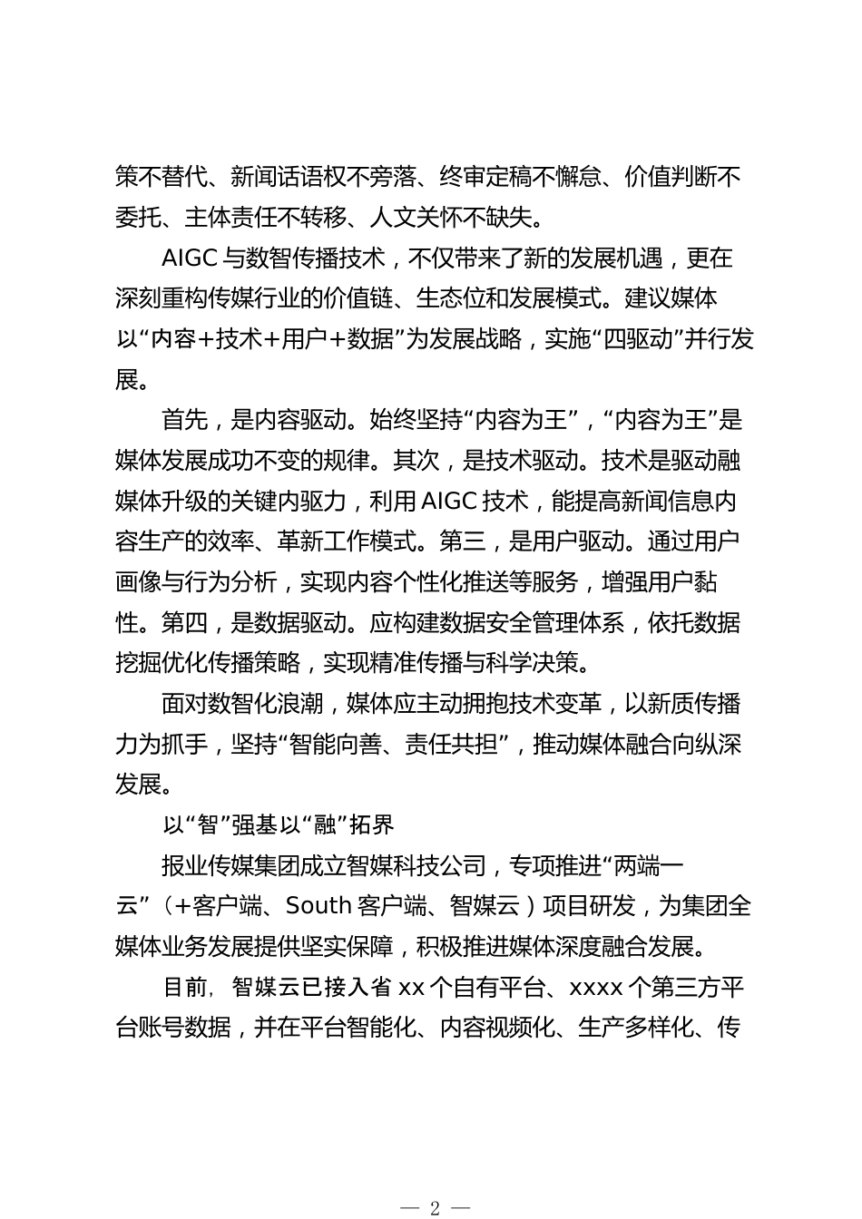 (6篇)在xx媒體融合創(chuàng)新與發(fā)展論壇上的發(fā)言材料匯編目錄1.引入前沿技術(shù)提升新質(zhì)傳播力22.“”“”以智強(qiáng)基以融拓界43.突破機(jī)制壁壘激發(fā)內(nèi)生動(dòng)力64.“推進(jìn)數(shù)智化升級(jí)打造媒體+”新生態(tài)85.深化改革創(chuàng)新建強(qiáng)融媒中心106.運(yùn)用人工智能大模型深度賦能媒體轉(zhuǎn)型12引入前沿技術(shù)提升新質(zhì)傳播力AIGC(人工智能生成內(nèi)容)對(duì)于人類(lèi)社會(huì)、人工智能的意義是里程碑式的。短期來(lái)看,AIGC改變了基礎(chǔ)的生產(chǎn)力工具;中期來(lái)看,會(huì)改變社會(huì)的生產(chǎn)關(guān)系;長(zhǎng)期來(lái)看,促使整個(gè)社會(huì)生產(chǎn)力發(fā)生質(zhì)的突破。在生產(chǎn)力工具、生產(chǎn)關(guān)系、生產(chǎn)力的變革中,AIGC把數(shù)據(jù)要素提升為時(shí)代的重要資源,在一定程度上...