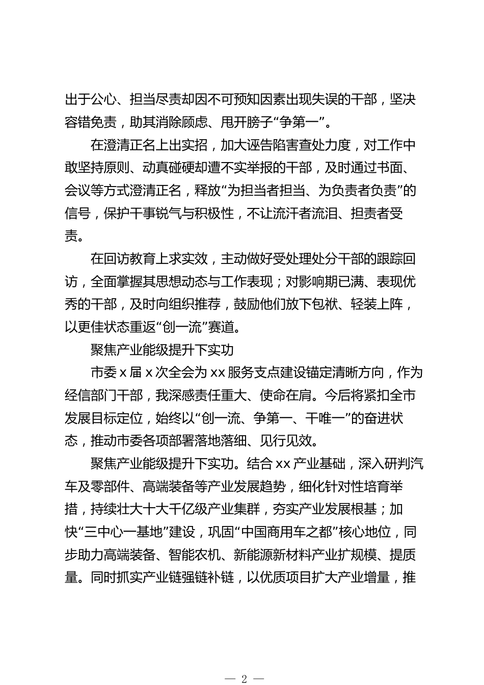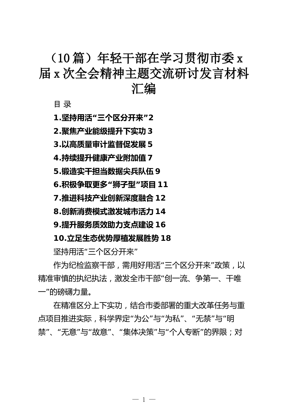 (10篇)年輕干部在學(xué)習(xí)貫徹市委x屆x次全會精神主題交流研討發(fā)言材料匯編目錄1.“”堅持用活三個區(qū)分開來22.聚焦產(chǎn)業(yè)能級提升下實功33.以高質(zhì)量審計監(jiān)督促發(fā)展54.持續(xù)提升健康產(chǎn)業(yè)附加值75.鍛造實干擔(dān)當(dāng)數(shù)據(jù)尖兵隊伍96.“”積極爭取更多獅子型項目117.推進科技產(chǎn)業(yè)創(chuàng)新深度融合128.創(chuàng)新消費模式激發(fā)城市活力149.提升服務(wù)質(zhì)效助力支點建設(shè)1610.立足生態(tài)優(yōu)勢厚植發(fā)展勝勢18“”堅持用活三個區(qū)分開來“”作為紀(jì)檢監(jiān)察干部,需用好用活三個區(qū)分開來政策,以“精準(zhǔn)審慎的執(zhí)紀(jì)執(zhí)法,激發(fā)全市干部創(chuàng)一流、爭第一、干唯”一的磅礴力量。在精準(zhǔn)區(qū)分上下實功,結(jié)合市委部署的重大改...