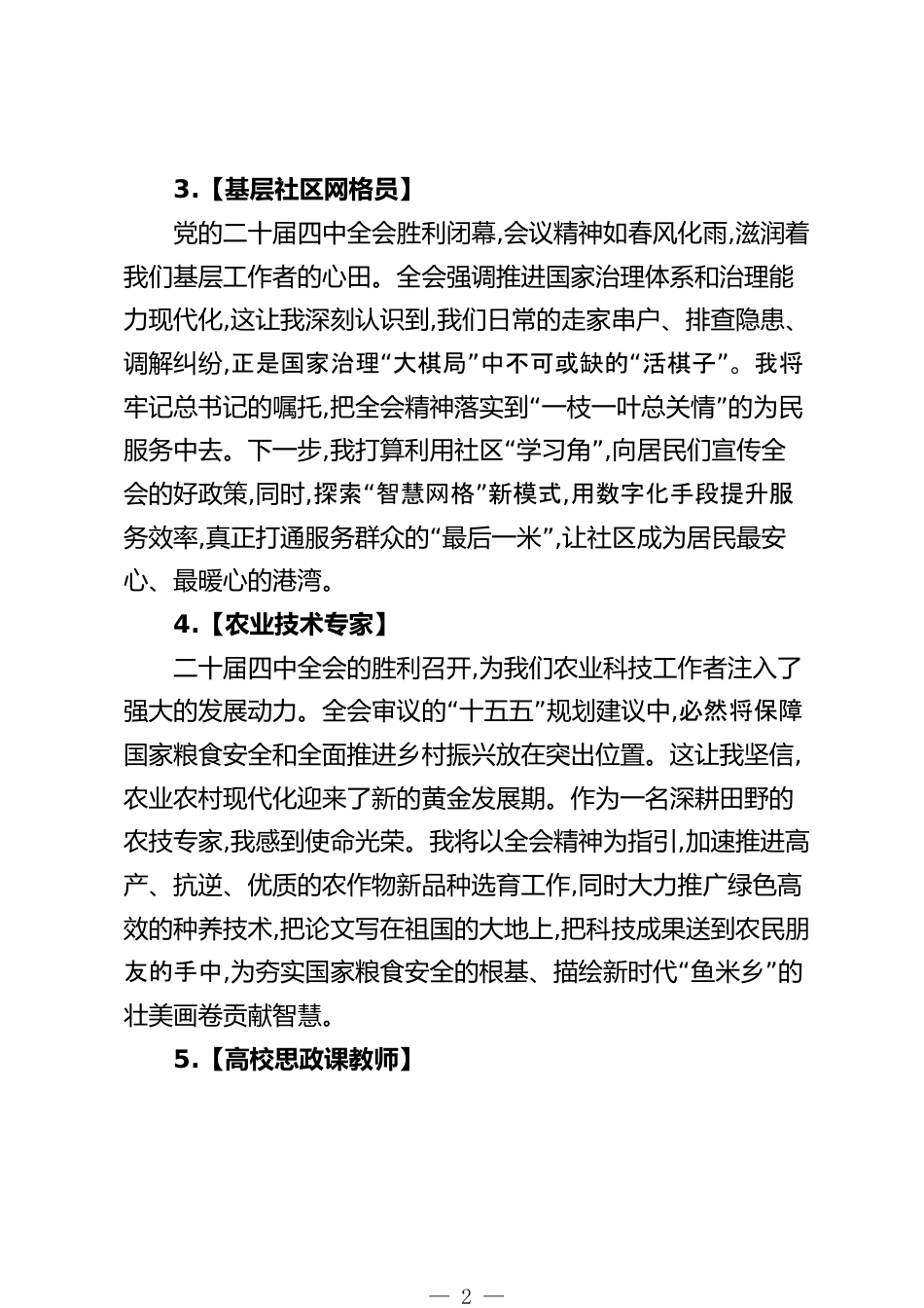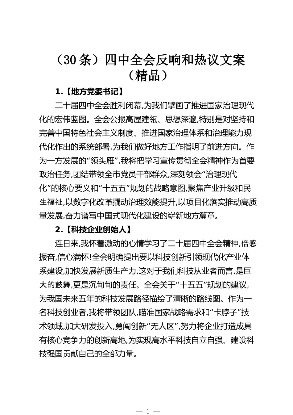 (30條)四中全會反響和熱議文案(精品)1.【地方黨委書記】二十屆四中全會勝利閉幕,為我們擘畫了推進(jìn)國家治理現(xiàn)代化的宏偉藍(lán)圖。全會公報(bào)高屋建瓴、思想深邃,特別是對堅(jiān)持和完善中國特色社會主義制度、推進(jìn)國家治理體系和治理能力現(xiàn)代化作出的系統(tǒng)部署,為我們做好地方工作指明了前進(jìn)方向。作“”為一方發(fā)展的領(lǐng)頭雁,我將把學(xué)習(xí)宣傳貫徹全會精神作為首要政治任務(wù),團(tuán)結(jié)帶領(lǐng)全市黨員干部群眾,“深刻領(lǐng)會治理現(xiàn)代”“”化的核心要義和十五五規(guī)劃的戰(zhàn)略意圖,聚焦產(chǎn)業(yè)升級和民生福祉,以數(shù)字化改革撬動治理效能提升,以項(xiàng)目化落實(shí)推動高質(zhì)量發(fā)展,奮力譜寫中國式現(xiàn)代化建設(shè)的嶄新...