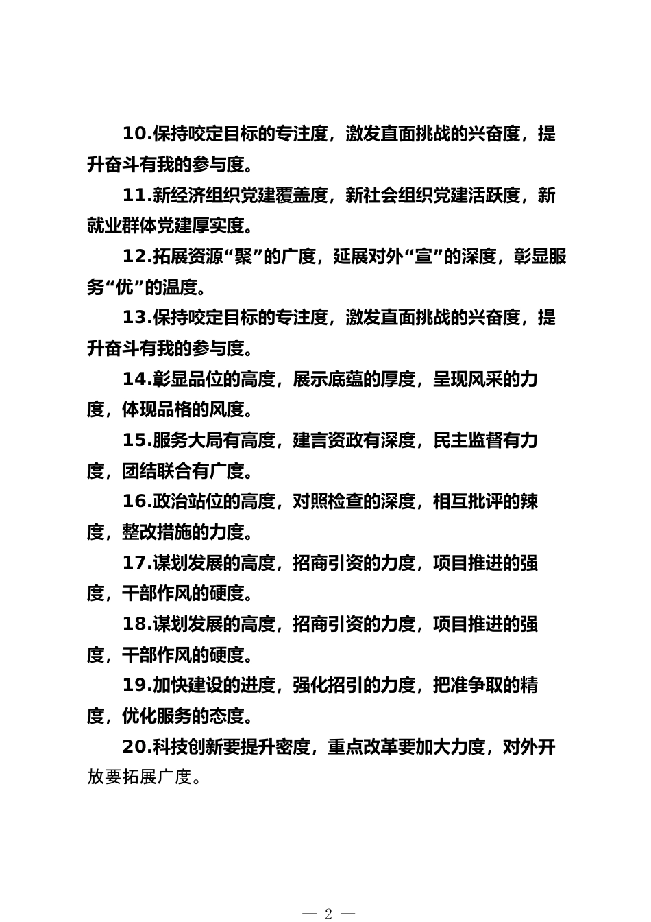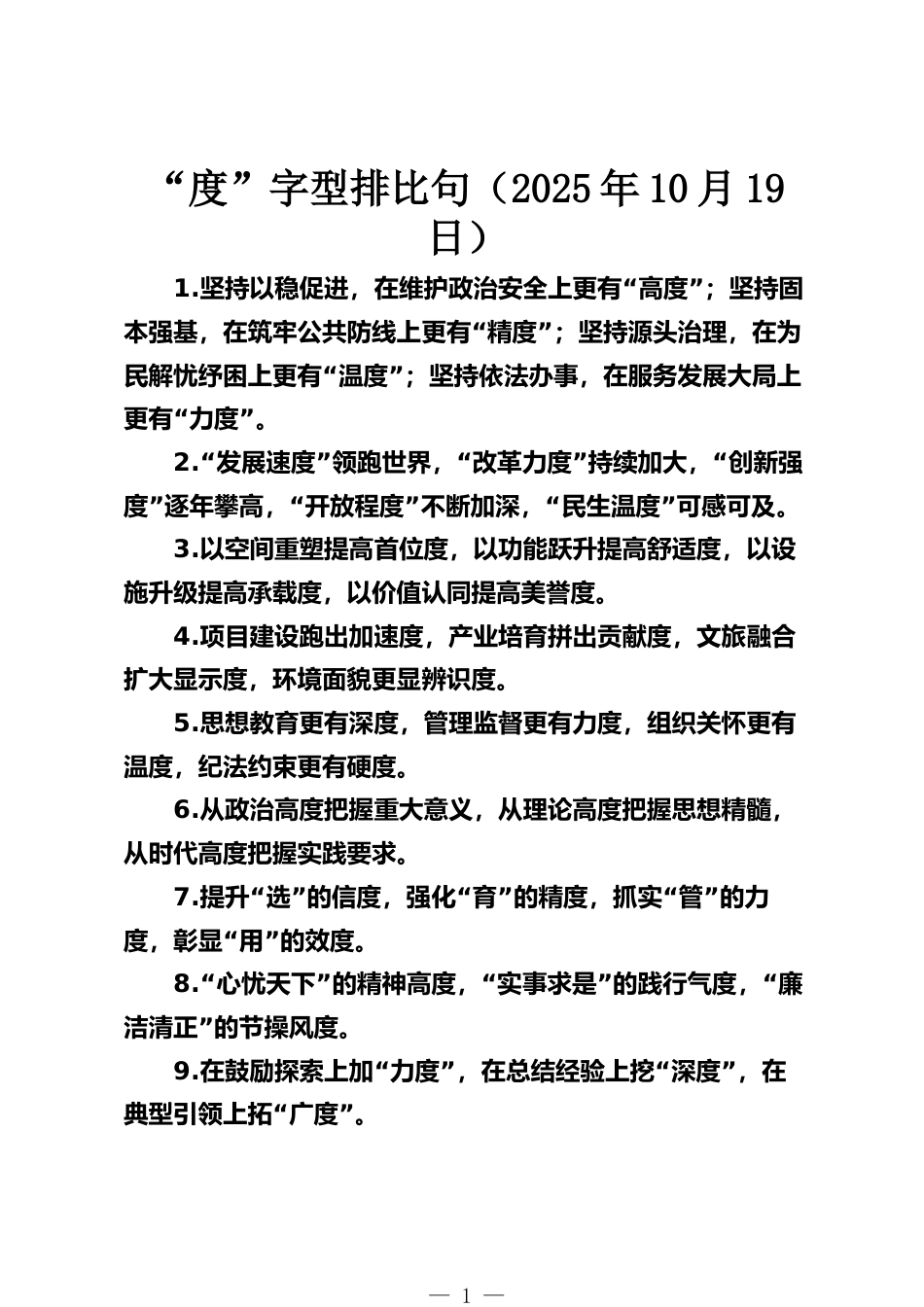 “度”字型排比句(2025年10月19日)1.“”堅(jiān)持以穩(wěn)促進(jìn),在維護(hù)政治安全上更有高度;堅(jiān)持固“”本強(qiáng)基,在筑牢公共防線上更有精度;堅(jiān)持源頭治理,在為“”民解憂紓困上更有溫度;堅(jiān)持依法辦事,在服務(wù)發(fā)展大局上“”更有力度。2.“”“”“發(fā)展速度領(lǐng)跑世界,改革力度持續(xù)加大,創(chuàng)新強(qiáng)”“”“”度逐年攀高,開(kāi)放程度不斷加深,民生溫度可感可及。3.以空間重塑提高首位度,以功能躍升提高舒適度,以設(shè)施升級(jí)提高承載度,以價(jià)值認(rèn)同提高美譽(yù)度。4.項(xiàng)目建設(shè)跑出加速度,產(chǎn)業(yè)培育拼出貢獻(xiàn)度,文旅融合擴(kuò)大顯示度,環(huán)境面貌更顯辨識(shí)度。5.思想教育更有深度,管理監(jiān)督更有力...