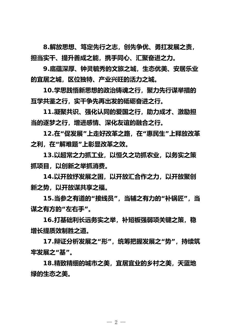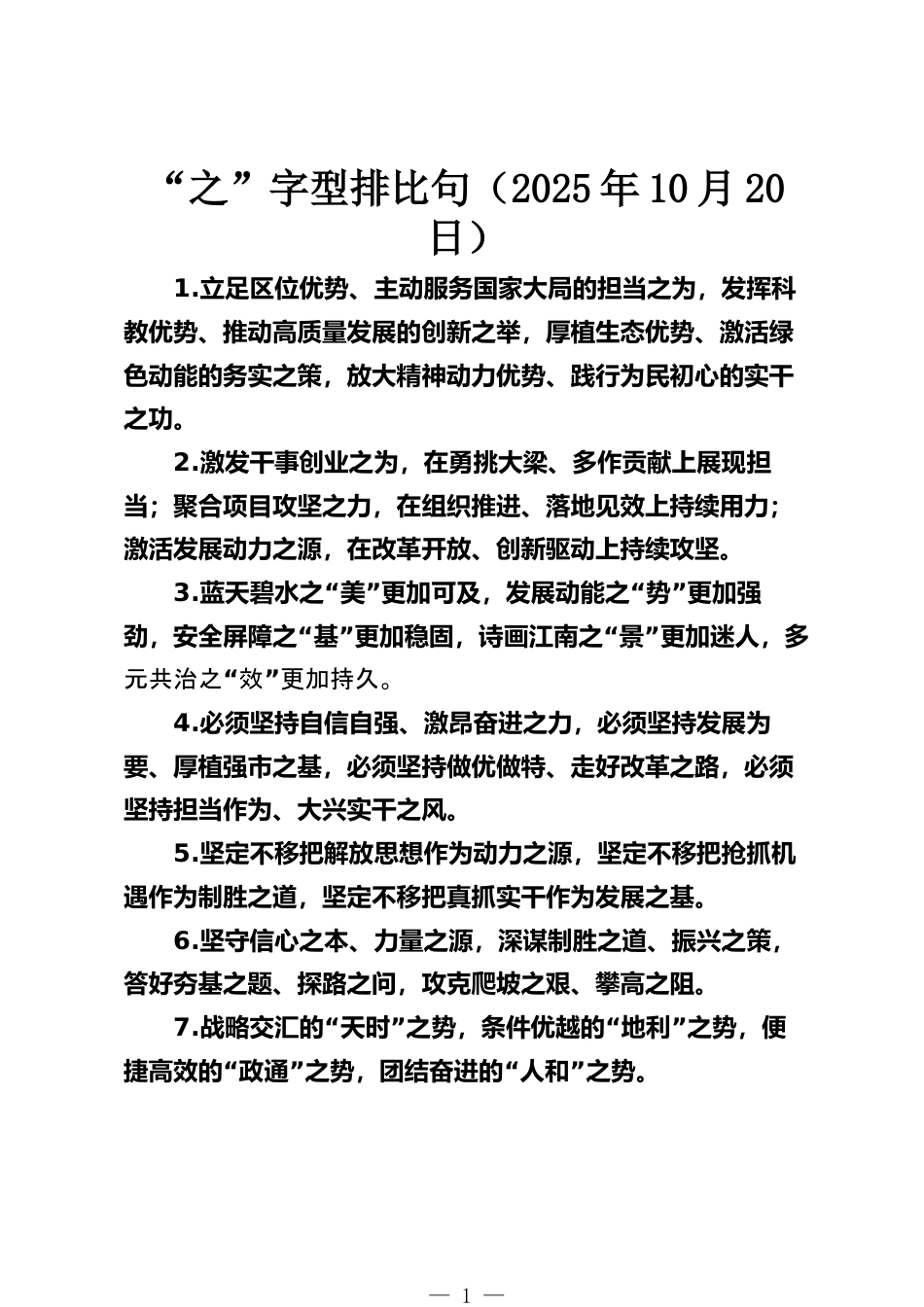 “之”字型排比句(2025年10月20日)1.立足區(qū)位優(yōu)勢(shì)、主動(dòng)服務(wù)國(guó)家大局的擔(dān)當(dāng)之為,發(fā)揮科教優(yōu)勢(shì)、推動(dòng)高質(zhì)量發(fā)展的創(chuàng)新之舉,厚植生態(tài)優(yōu)勢(shì)、激活綠色動(dòng)能的務(wù)實(shí)之策,放大精神動(dòng)力優(yōu)勢(shì)、踐行為民初心的實(shí)干之功。2.激發(fā)干事創(chuàng)業(yè)之為,在勇挑大梁、多作貢獻(xiàn)上展現(xiàn)擔(dān)當(dāng);聚合項(xiàng)目攻堅(jiān)之力,在組織推進(jìn)、落地見效上持續(xù)用力;激活發(fā)展動(dòng)力之源,在改革開放、創(chuàng)新驅(qū)動(dòng)上持續(xù)攻堅(jiān)。3.“”“”藍(lán)天碧水之美更加可及,發(fā)展動(dòng)能之勢(shì)更加強(qiáng)“”“”勁,安全屏障之基更加穩(wěn)固,詩畫江南之景更加迷人,多“”元共治之效更加持久。4.必須堅(jiān)持自信自強(qiáng)、激昂奮進(jìn)之力,必須堅(jiān)持發(fā)展為...