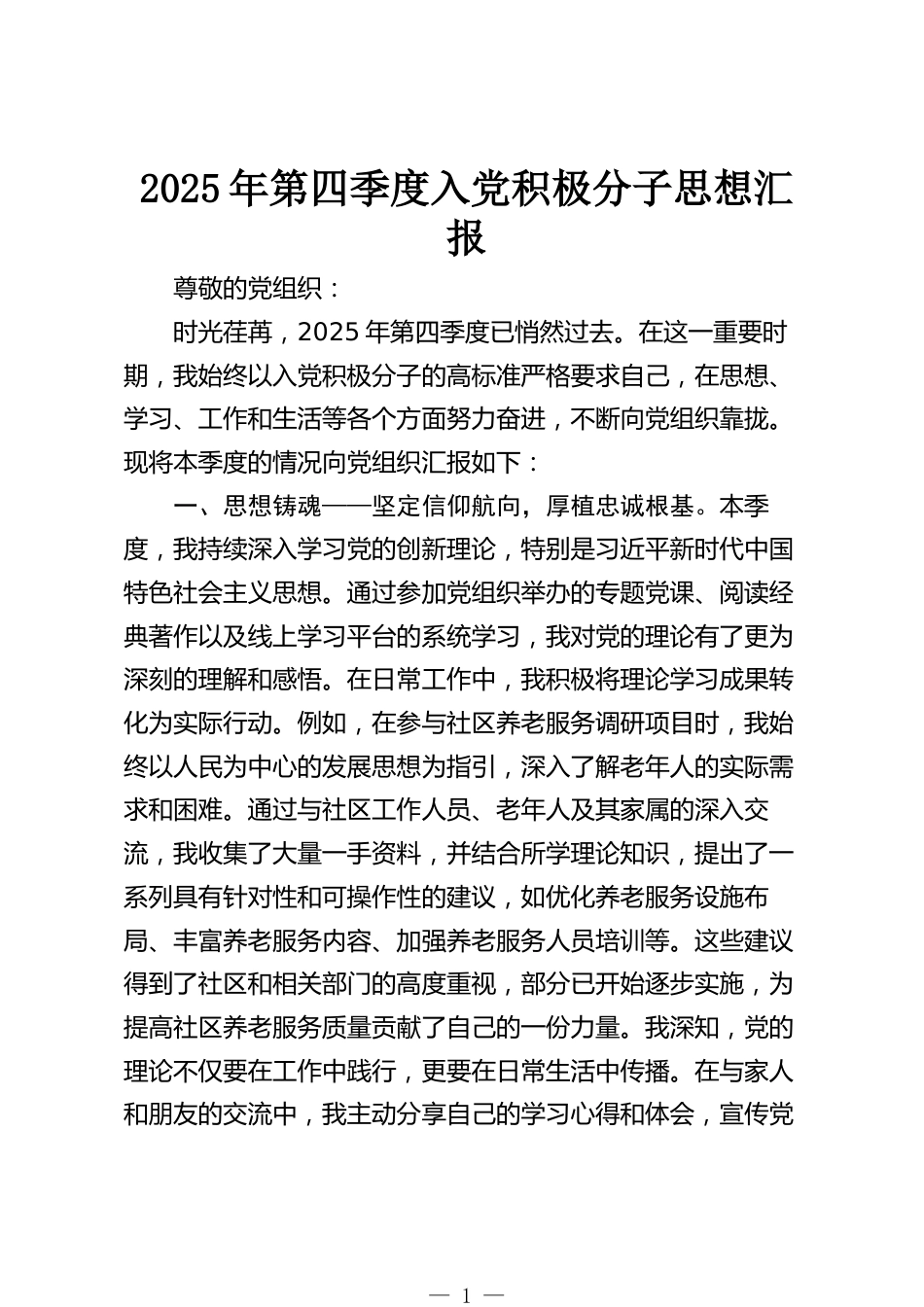 2025年第四季度入黨積極分子思想?yún)R報尊敬的黨組織:時光荏苒,2025年第四季度已悄然過去。在這一重要時期,我始終以入黨積極分子的高標準嚴格要求自己,在思想、學習、工作和生活等各個方面努力奮進,不斷向黨組織靠攏。現(xiàn)將本季度的情況向黨組織匯報如下:一、思想鑄魂——堅定信仰航向,厚植忠誠根基。本季度,我持續(xù)深入學習黨的創(chuàng)新理論,特別是習近平新時代中國特色社會主義思想。通過參加黨組織舉辦的專題黨課、閱讀經(jīng)典著作以及線上學習平臺的系統(tǒng)學習,我對黨的理論有了更為深刻的理解和感悟。在日常工作中,我積極將理論學習成果轉(zhuǎn)化為實際行動。例如,在參與社...
