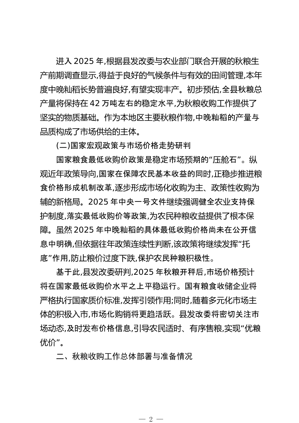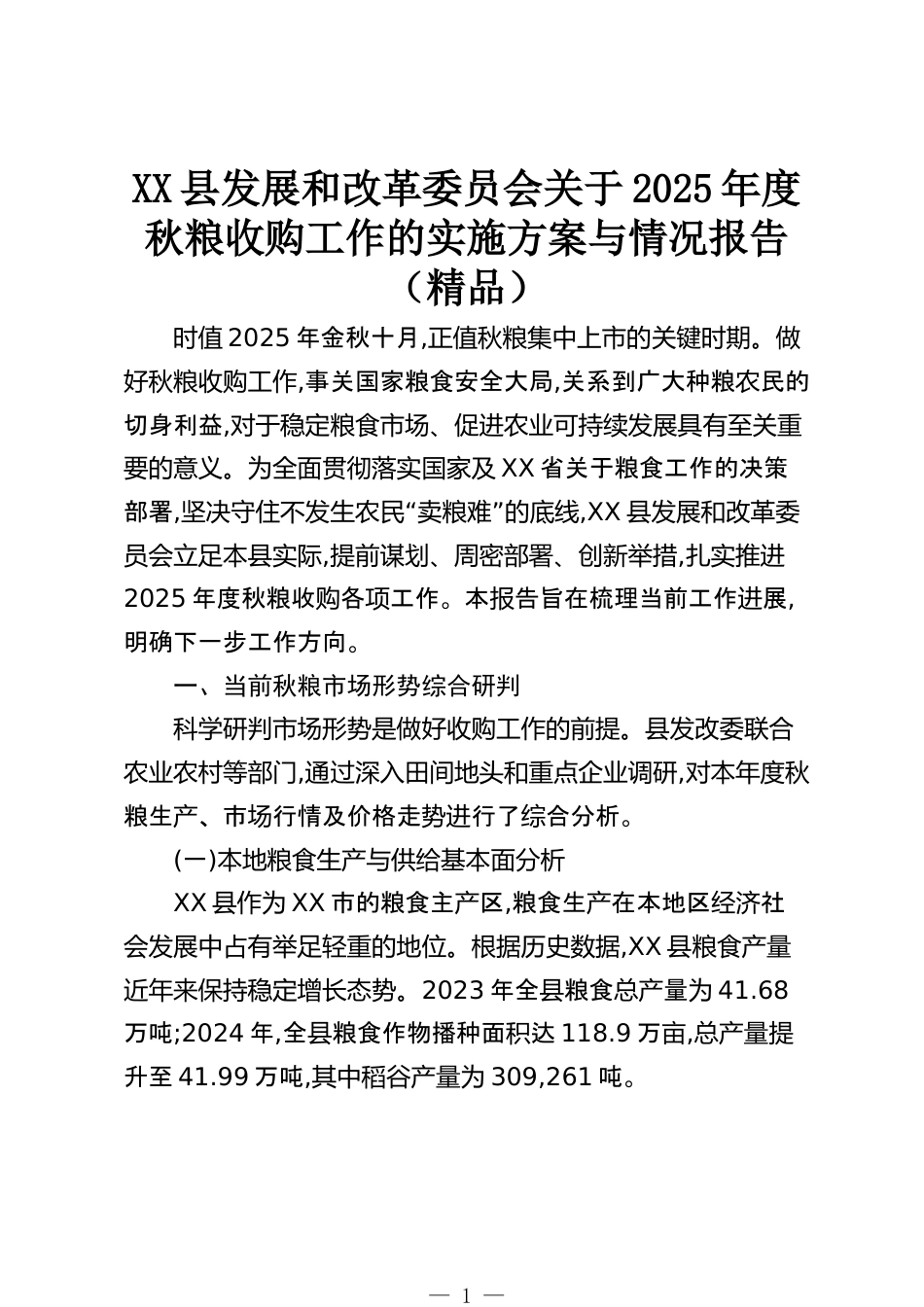 XX縣發(fā)展和改革委員會關(guān)于2025年度秋糧收購工作的實施方案與情況報告(精品)