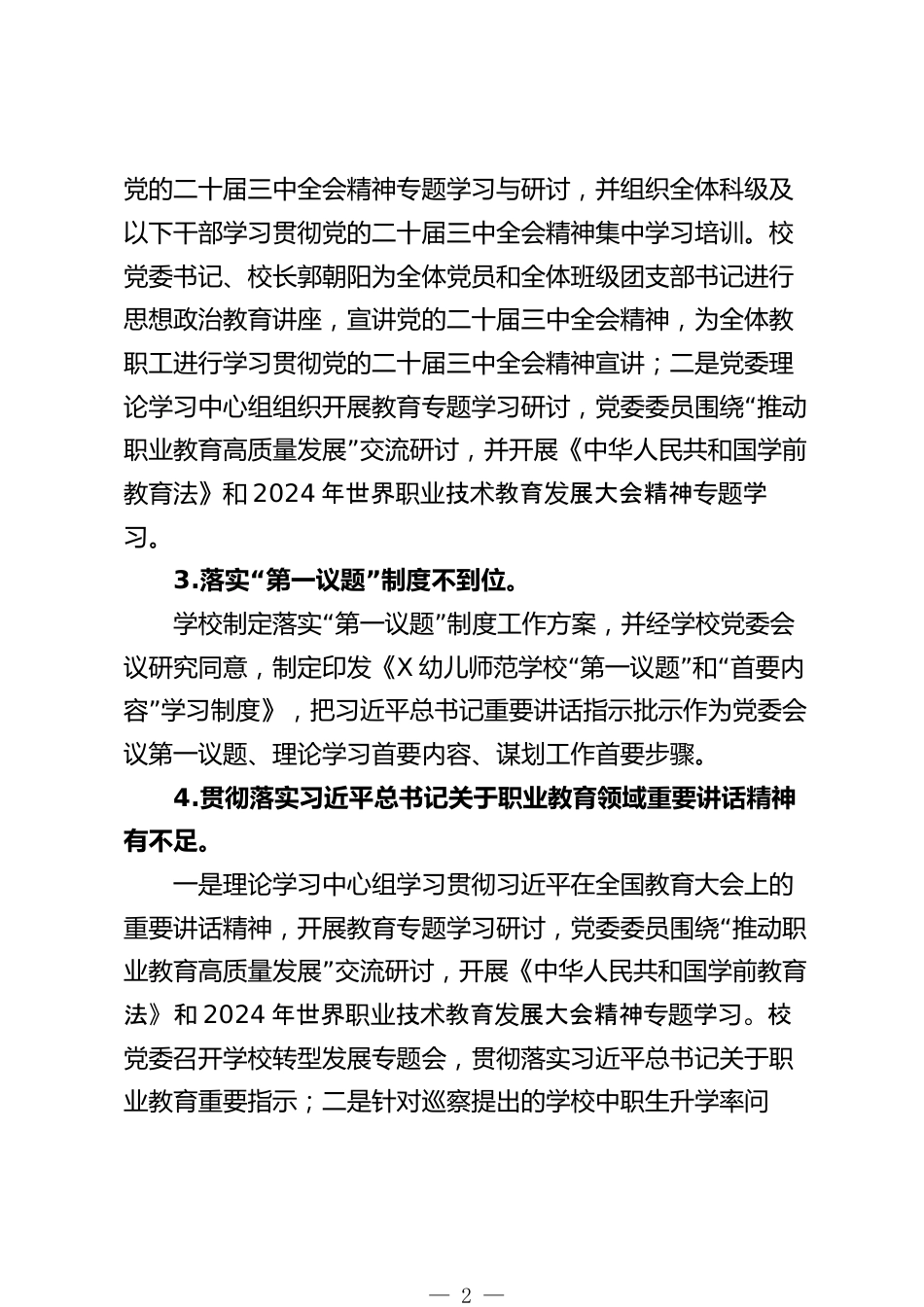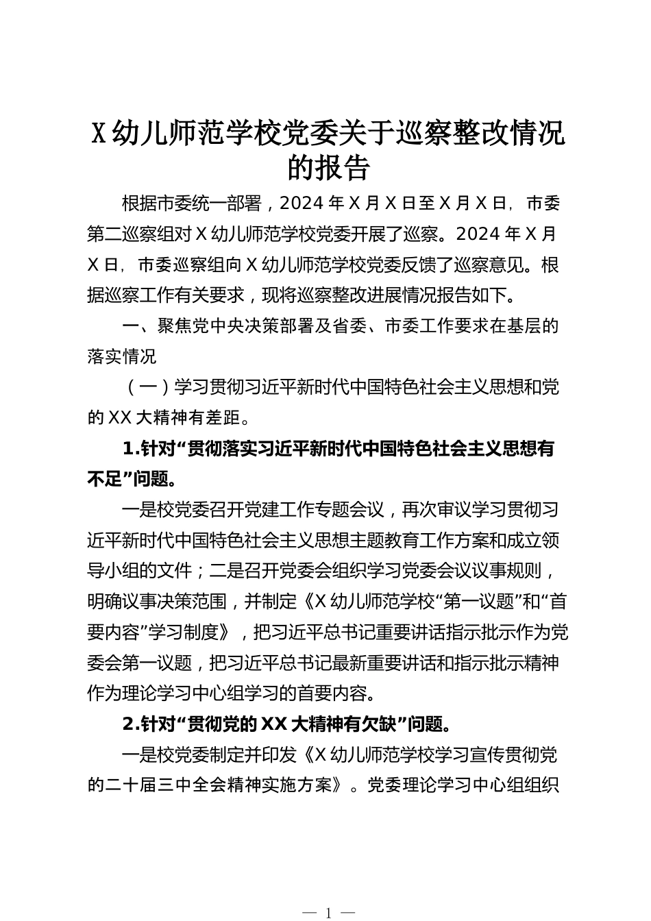 X幼兒師范學(xué)校黨委關(guān)于巡察整改情況的報告根據(jù)市委統(tǒng)一部署,2024年X月X日至X月X日,市委第二巡察組對X幼兒師范學(xué)校黨委開展了巡察。2024年X月X日,市委巡察組向X幼兒師范學(xué)校黨委反饋了巡察意見。根據(jù)巡察工作有關(guān)要求,現(xiàn)將巡察整改進展情況報告如下。一、聚焦黨中央決策部署及省委、市委工作要求在基層的落實情況(一)學(xué)習(xí)貫徹習(xí)近平新時代中國特色社會主義思想和黨的XX大精神有差距。1.“針對貫徹落實習(xí)近平新時代中國特色社會主義思想有”不足問題。一是校黨委召開黨建工作專題會議,再次審議學(xué)習(xí)貫徹習(xí)近平新時代中國特色社會主義思想主題教育工作方案和成立領(lǐng)導(dǎo)...