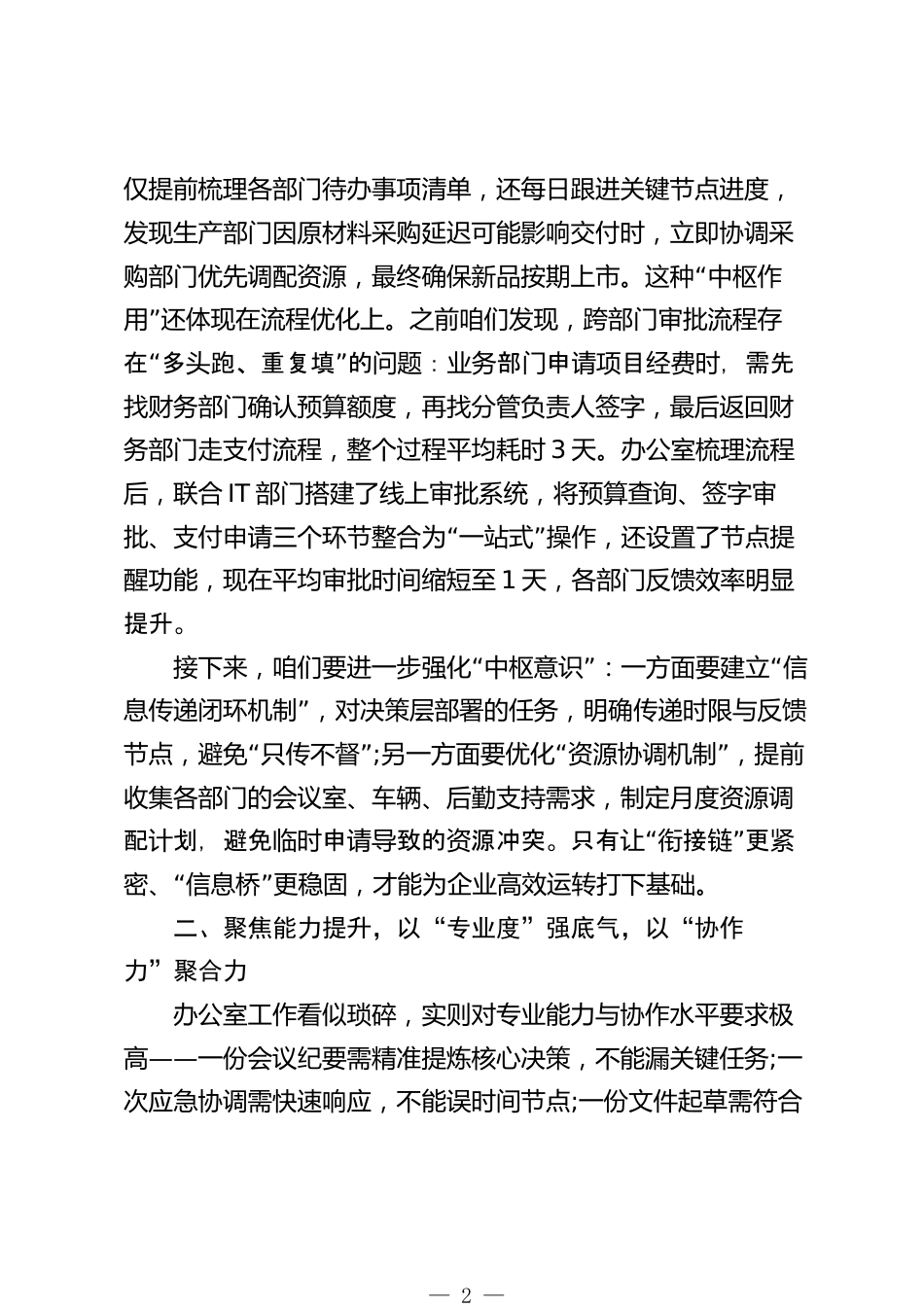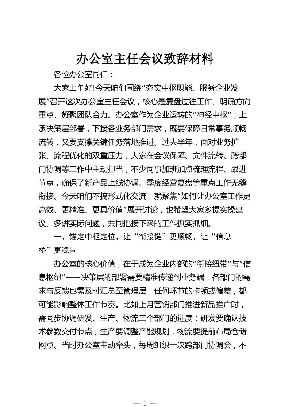 辦公室主任會議致辭材料各位辦公室同仁:大家上午好!“今天咱們圍繞夯實中樞職能、服務(wù)企業(yè)發(fā)”展召開這次辦公室主任會議,核心是復(fù)盤過往工作、明確方向“”重點、凝聚團隊合力。辦公室作為企業(yè)運轉(zhuǎn)的神經(jīng)中樞,上承決策層部署,下接各業(yè)務(wù)部門需求,既要保障日常事務(wù)順暢流轉(zhuǎn),又要支撐關(guān)鍵任務(wù)落地推進。過去半年,面對業(yè)務(wù)擴張、流程優(yōu)化的雙重壓力,大家在會議保障、文件流轉(zhuǎn)、跨部門協(xié)調(diào)等工作中主動擔(dān)當(dāng),不少同事加班加點梳理流程、跟進節(jié)點,確保了新產(chǎn)品上線協(xié)調(diào)、季度經(jīng)營復(fù)盤等重點工作無縫“銜接。今天咱們不搞形式化交流,就聚焦如何讓辦公室工作更”高效...
