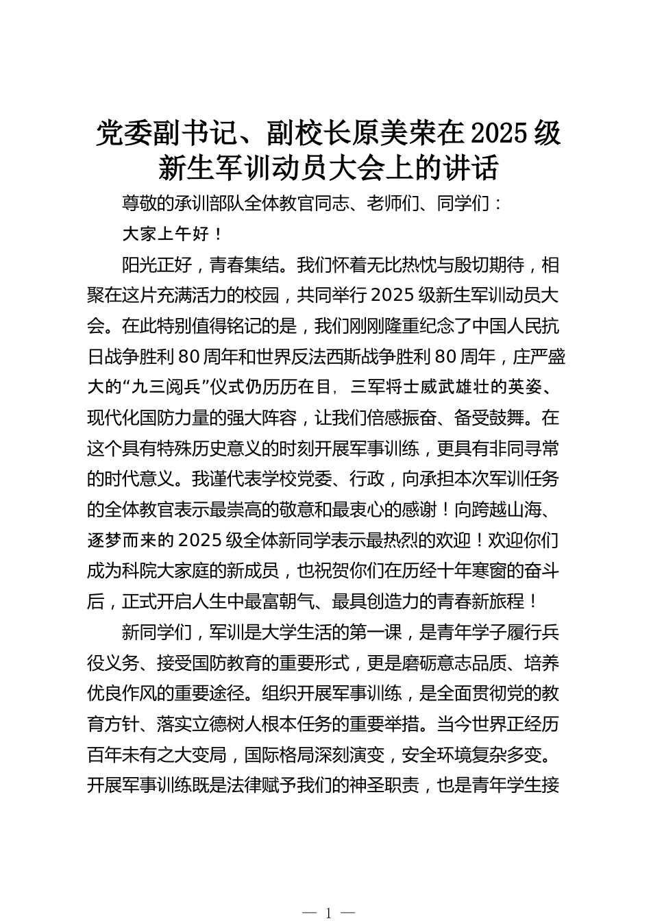 黨委副書記、副校長(zhǎng)原美榮在2025級(jí)新生軍訓(xùn)動(dòng)員大會(huì)上的講話