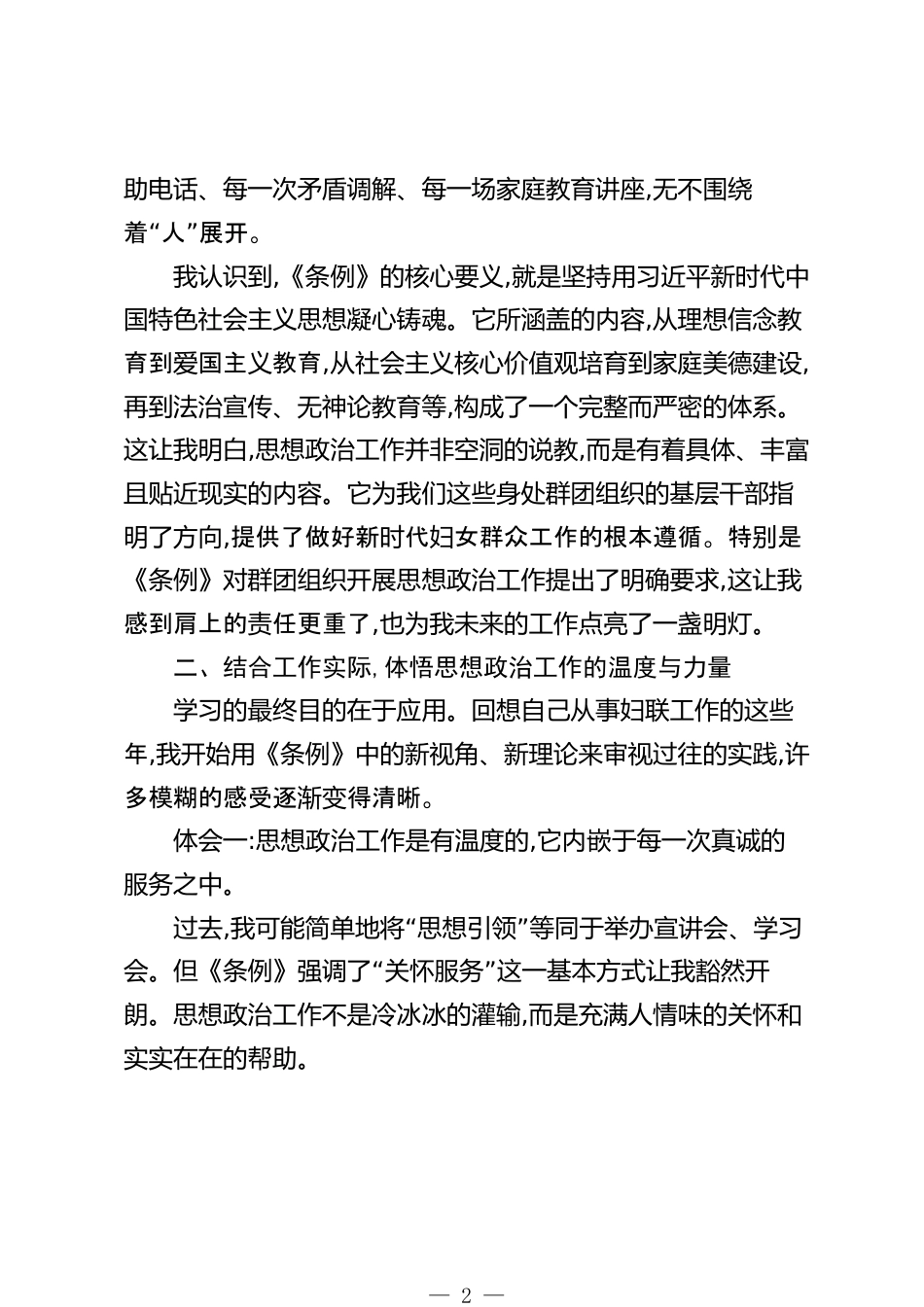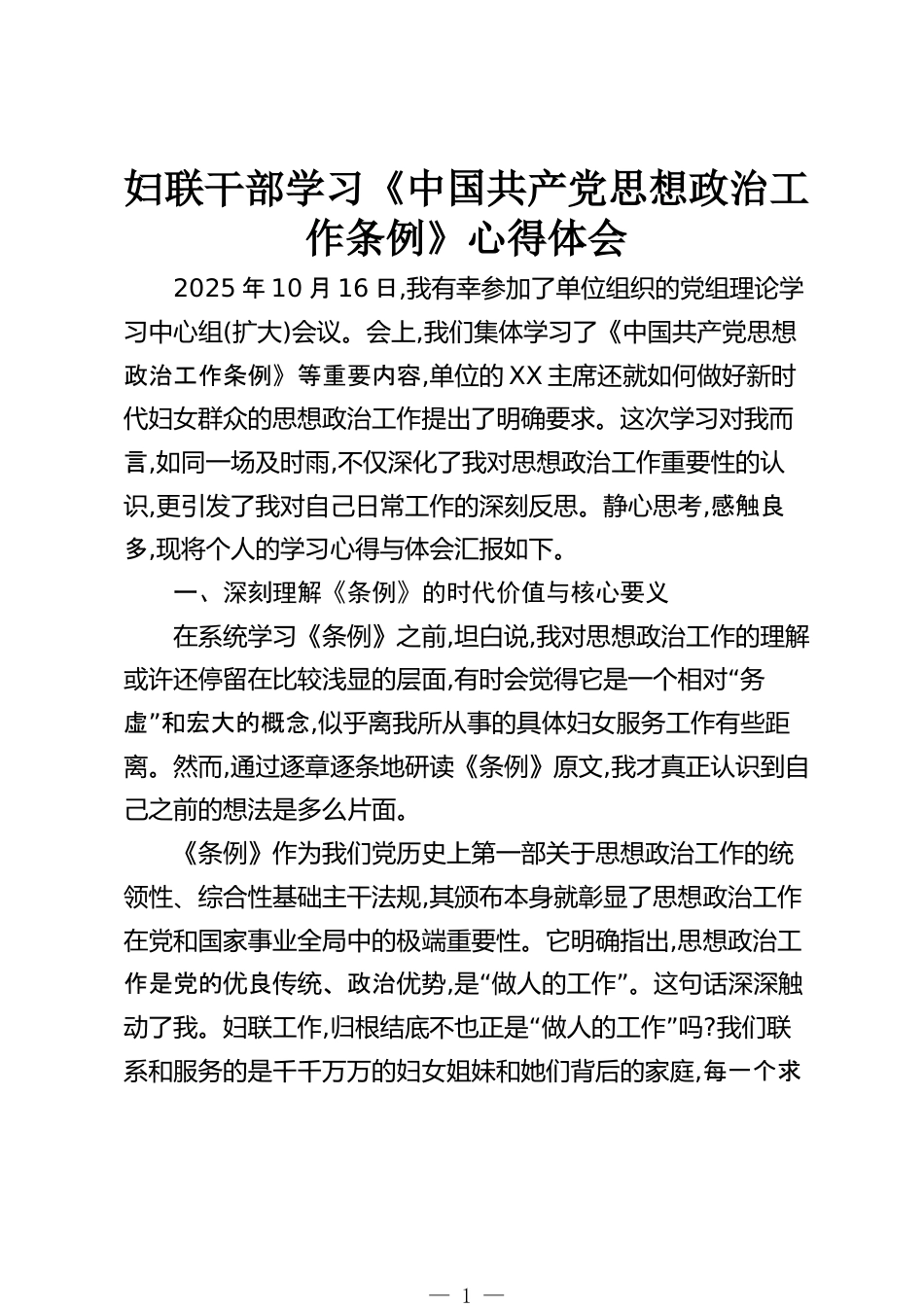 婦聯(lián)干部學(xué)習(xí)《中國共產(chǎn)黨思想政治工作條例》心得體會(huì)2025年10月16日,我有幸參加了單位組織的黨組理論學(xué)習(xí)中心組(擴(kuò)大)會(huì)議。會(huì)上,我們集體學(xué)習(xí)了《中國共產(chǎn)黨思想政治工作條例》等重要內(nèi)容,單位的XX主席還就如何做好新時(shí)代婦女群眾的思想政治工作提出了明確要求。這次學(xué)習(xí)對(duì)我而言,如同一場(chǎng)及時(shí)雨,不僅深化了我對(duì)思想政治工作重要性的認(rèn)識(shí),更引發(fā)了我對(duì)自己日常工作的深刻反思。靜心思考,感觸良多,現(xiàn)將個(gè)人的學(xué)習(xí)心得與體會(huì)匯報(bào)如下。一、深刻理解《條例》的時(shí)代價(jià)值與核心要義在系統(tǒng)學(xué)習(xí)《條例》之前,坦白說,我對(duì)思想政治工作的理解或許還停留在比較淺顯的層面,“有時(shí)...