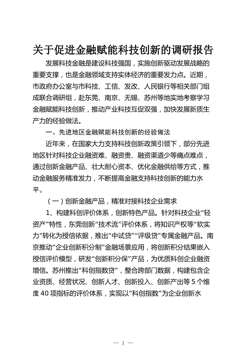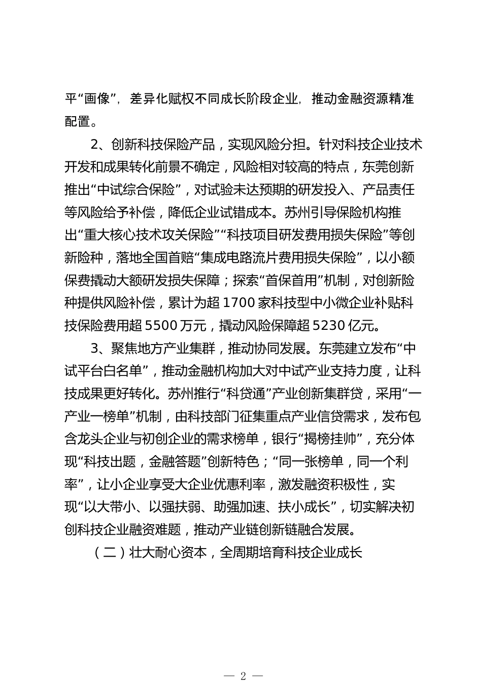 關(guān)于促進(jìn)金融賦能科技創(chuàng)新的調(diào)研報(bào)告發(fā)展科技金融是建設(shè)科技強(qiáng)國(guó),實(shí)施創(chuàng)新驅(qū)動(dòng)發(fā)展戰(zhàn)略的重要支撐,也是金融領(lǐng)域支持實(shí)體經(jīng)濟(jì)的重要發(fā)力點(diǎn)。近期,市政府辦公室與市科技、工信、發(fā)改、人民銀行等相關(guān)部門組成聯(lián)合調(diào)研組,赴東莞、南京、無(wú)錫、蘇州等地實(shí)地考察學(xué)習(xí)金融賦能科技創(chuàng)新,推動(dòng)產(chǎn)業(yè)科技互促雙強(qiáng),加快發(fā)展新質(zhì)生產(chǎn)力的經(jīng)驗(yàn)做法。一、先進(jìn)地區(qū)金融賦能科技創(chuàng)新的經(jīng)驗(yàn)做法近年來(lái),在國(guó)家大力支持科技創(chuàng)新政策引領(lǐng)下,部分先進(jìn)地區(qū)針對(duì)科技企業(yè)融資難、融資貴、融資渠道少等痛點(diǎn)難點(diǎn),通過(guò)創(chuàng)新金融產(chǎn)品、壯大耐心資本、優(yōu)化金融供給等方式,推動(dòng)金融服務(wù)精準(zhǔn)發(fā)力...