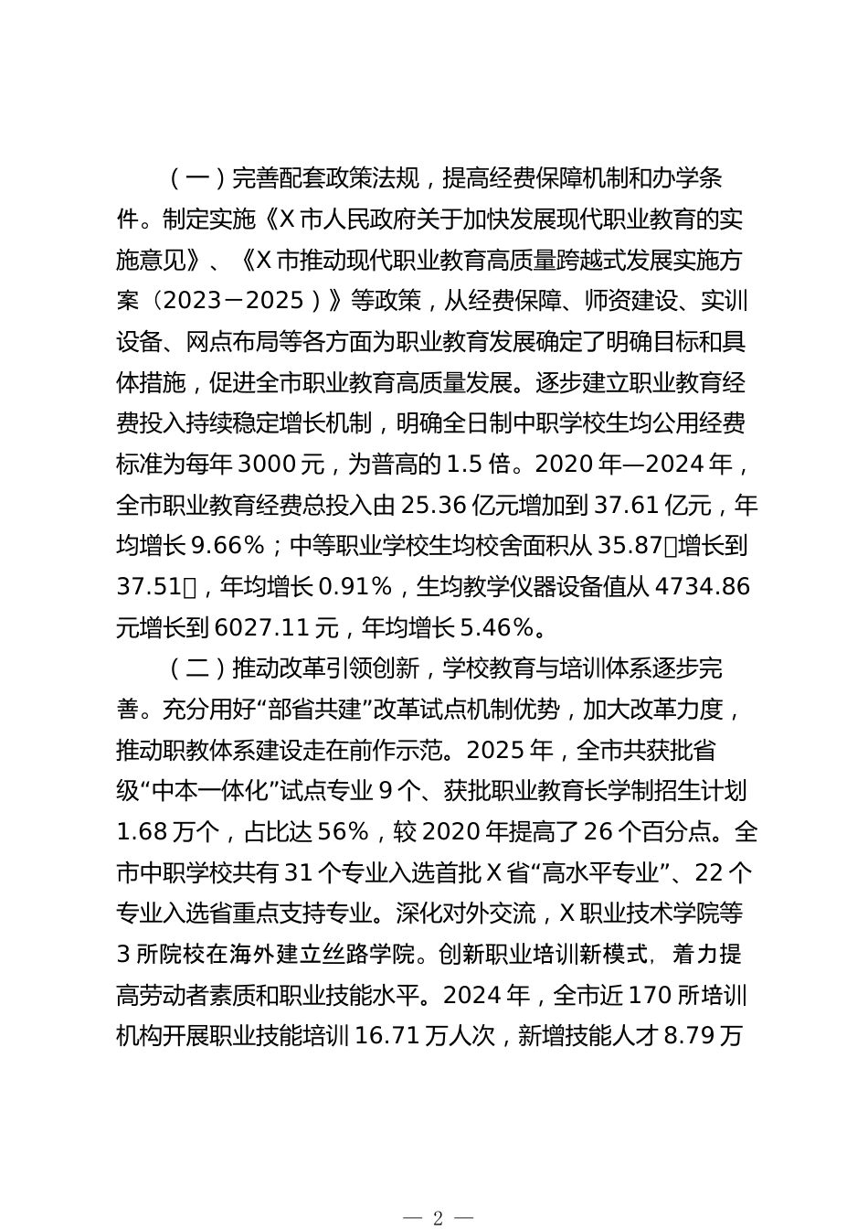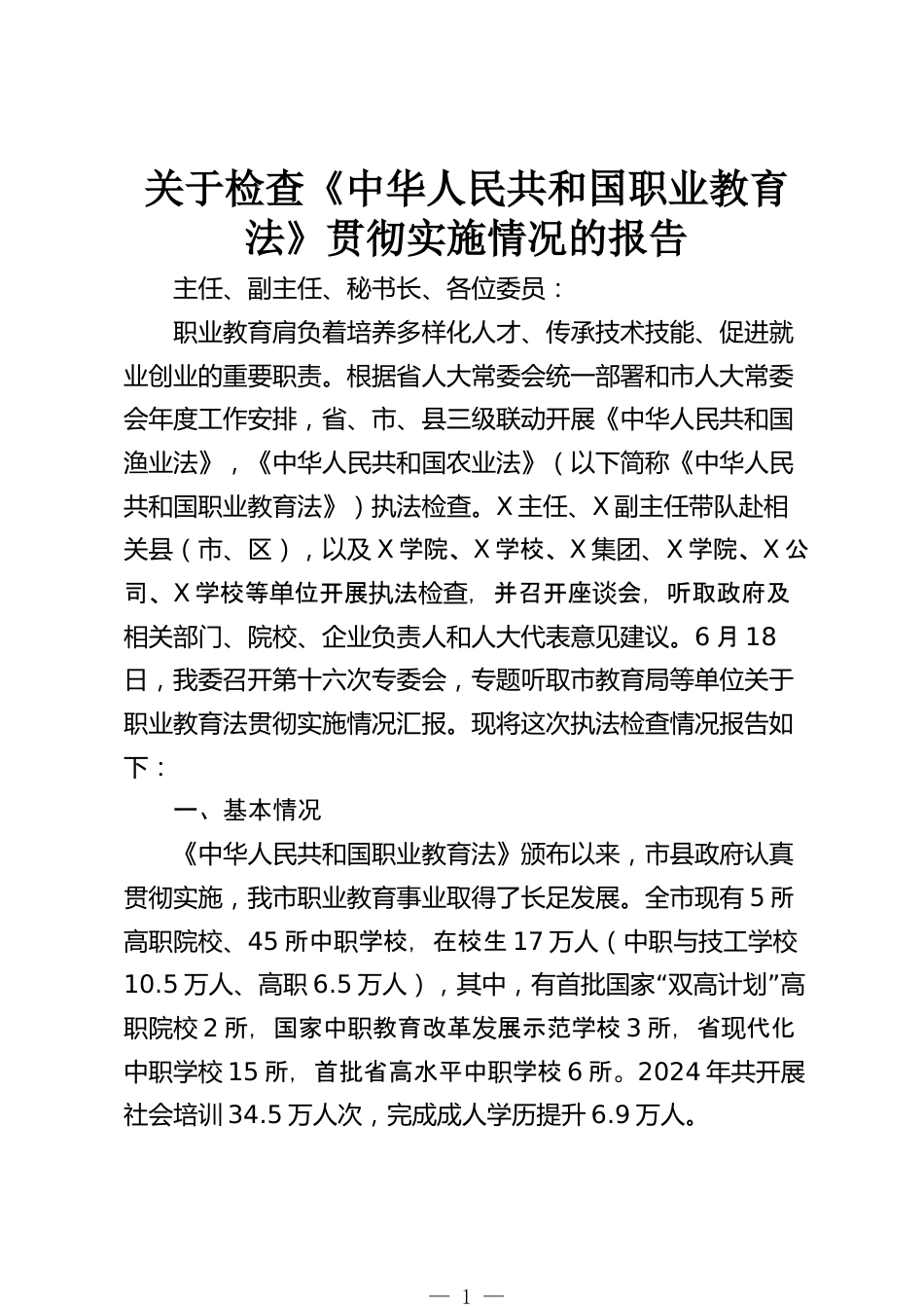 關(guān)于檢查《中華人民共和國職業(yè)教育法》貫徹實施情況的報告主任、副主任、秘書長、各位委員:職業(yè)教育肩負(fù)著培養(yǎng)多樣化人才、傳承技術(shù)技能、促進就業(yè)創(chuàng)業(yè)的重要職責(zé)。根據(jù)省人大常委會統(tǒng)一部署和市人大常委會年度工作安排,省、市、縣三級聯(lián)動開展《中華人民共和國漁業(yè)法》,《中華人民共和國農(nóng)業(yè)法》(以下簡稱《中華人民共和國職業(yè)教育法》)執(zhí)法檢查。X主任、X副主任帶隊赴相關(guān)縣(市、區(qū)),以及X學(xué)院、X學(xué)校、X集團、X學(xué)院、X公司、X學(xué)校等位開展法,并召開座會,聽取政府及單執(zhí)檢查談相關(guān)部門、院校、企業(yè)負(fù)責(zé)人和人大代表意見建議。6月18日,我委召開第十六次專委...