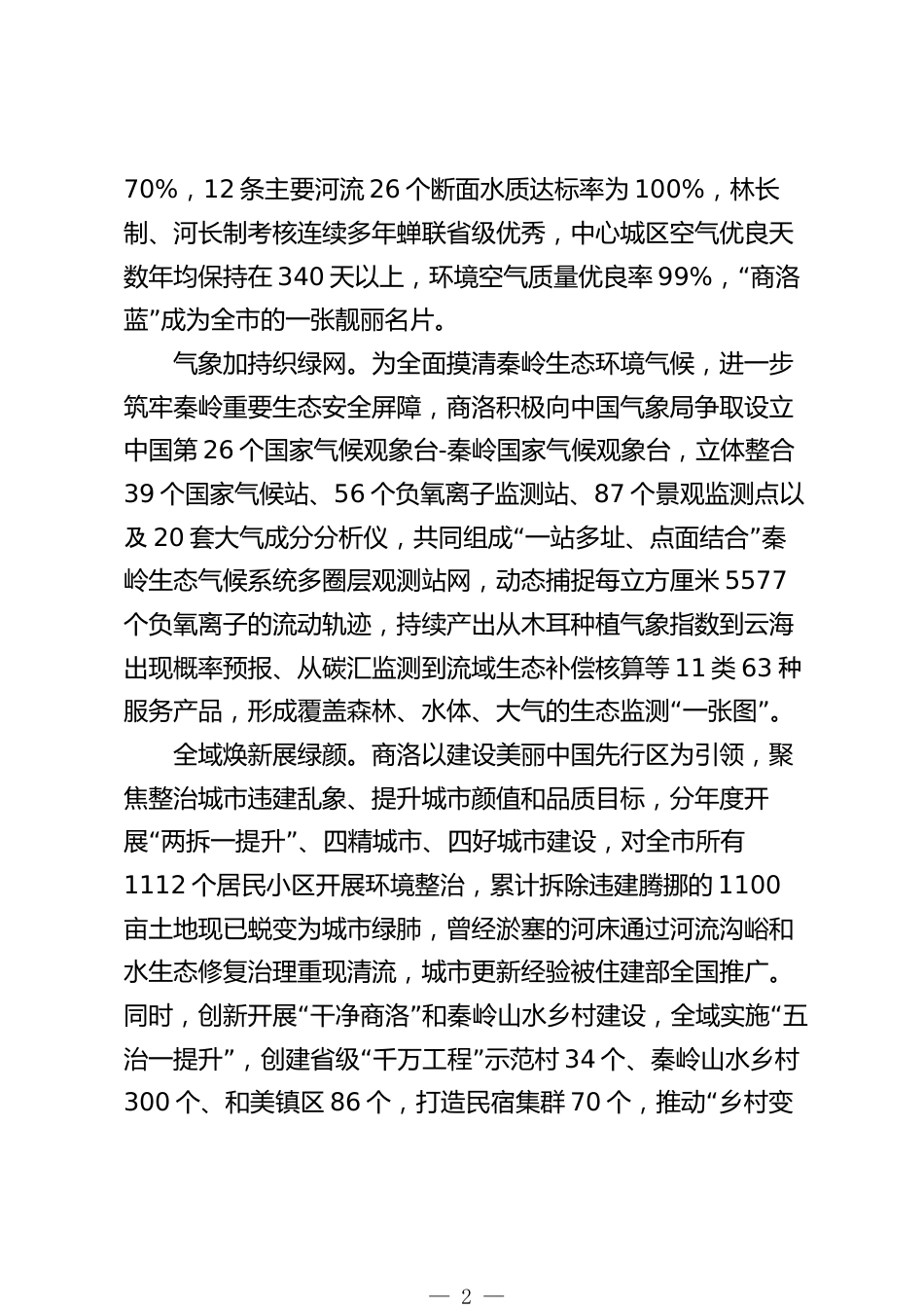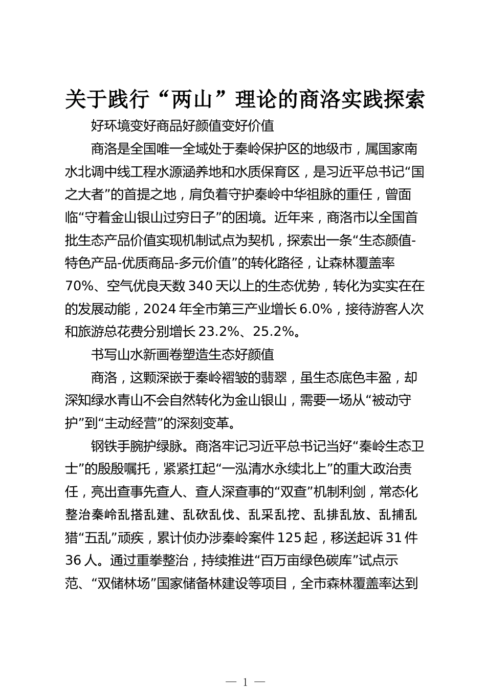 關(guān)于踐行“兩山”理論的商洛實踐探索好環(huán)境變好商品好顏值變好價值商洛是全國唯一全域處于秦嶺保護區(qū)的地級市,屬國家南“水北調(diào)中線工程水源涵養(yǎng)地和水質(zhì)保育區(qū),是習近平總書記國”之大者的首提之地,肩負著守護秦嶺中華祖脈的重任,曾面“”臨守著金山銀山過窮日子的困境。近年來,商洛市以全國首“批生態(tài)產(chǎn)品價值實現(xiàn)機制試點為契機,探索出一條生態(tài)顏值-特色產(chǎn)品-優(yōu)質(zhì)商品-”多元價值的轉(zhuǎn)化路徑,讓森林覆蓋率70%、空氣優(yōu)良天數(shù)340天以上的生態(tài)優(yōu)勢,轉(zhuǎn)化為實實在在的發(fā)展動能,2024年全市第三產(chǎn)業(yè)增長6.0%,接待游客人次和旅游總花費分別增長23.2%、25.2%。書寫山...
