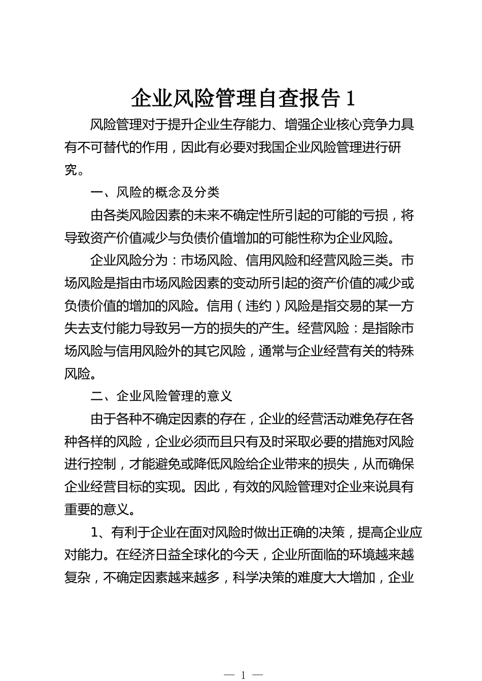 企業(yè)風險管理自查報告1風險管理對于提升企業(yè)生存能力、增強企業(yè)核心競爭力具有不可替代的作用,因此有必要對我國企業(yè)風險管理進行研究。一、風險的概念及分類由各類風險因素的未來不確定性所引起的可能的虧損,將導致資產(chǎn)價值減少與負債價值增加的可能性稱為企業(yè)風險。企業(yè)風險分為:市場風險、信用風險和經(jīng)營風險三類。市場風險是指由市場風險因素的變動所引起的資產(chǎn)價值的減少或負債價值的增加的風險。信用(違約)風險是指交易的某一方失去支付能力導致另一方的損失的產(chǎn)生。經(jīng)營風險:是指除市場風險與信用風險外的其它風險,通常與企業(yè)經(jīng)營有關(guān)的特殊風險。二、企業(yè)...