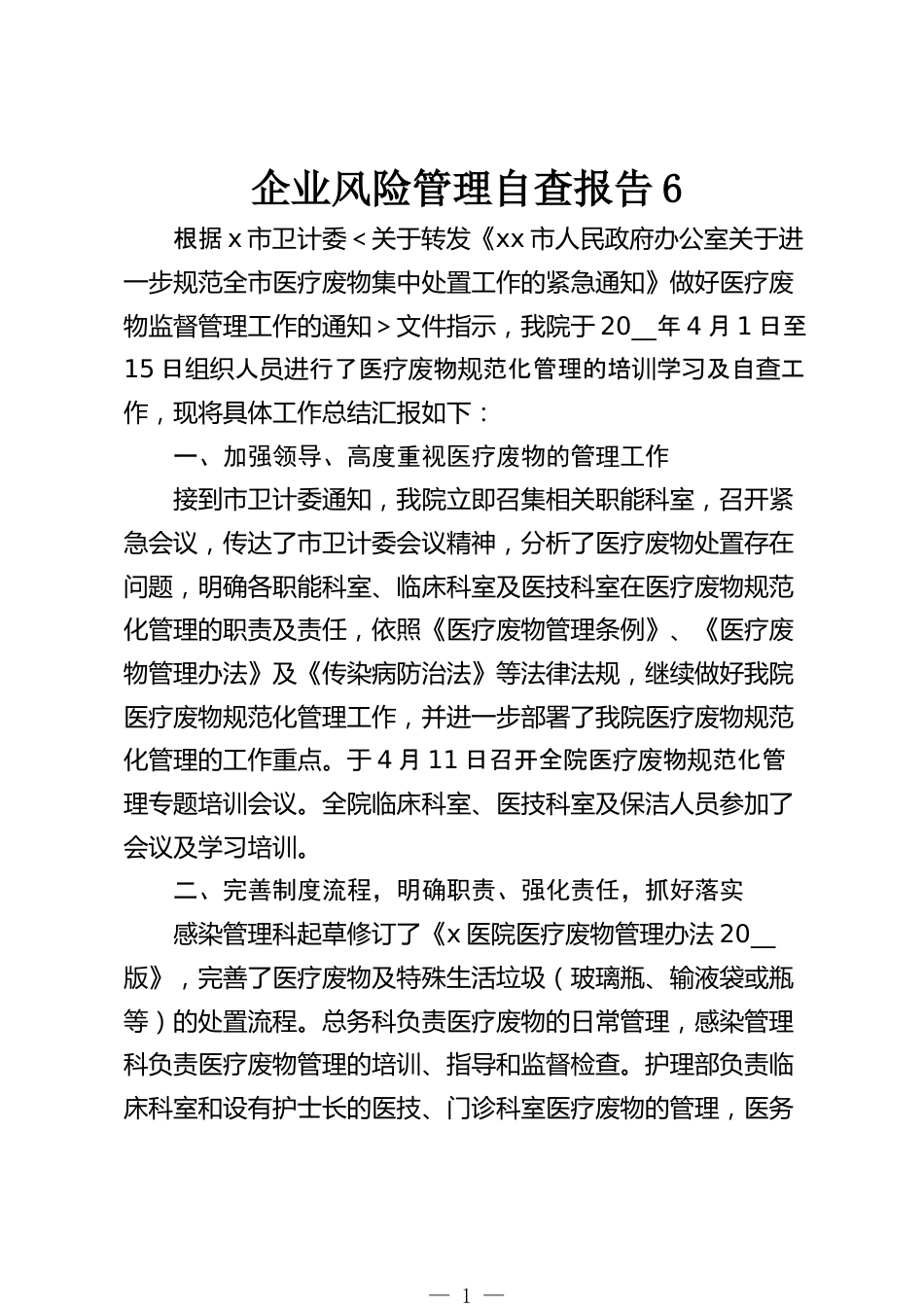 企業(yè)風(fēng)險管理自查報告6根據(jù)x市衛(wèi)計委<關(guān)于轉(zhuǎn)發(fā)《xx市人民政府辦公室關(guān)于進一步規(guī)范全市醫(yī)療廢物集中處置工作的緊急通知》做好醫(yī)療廢物監(jiān)督管理工作的通知>文件指示,我院于20__年4月1日至15日人行了醫(yī)物范化管理的培學(xué)及自工組織員進療廢規(guī)訓(xùn)習(xí)查作,現(xiàn)將具體工作總結(jié)匯報如下:一、加強領(lǐng)導(dǎo)、高度重視醫(yī)療廢物的管理工作接到市衛(wèi)計委通知,我院立即召集相關(guān)職能科室,召開緊急會議,傳達了市衛(wèi)計委會議精神,分析了醫(yī)療廢物處置存在問題,明確各職能科室、臨床科室及醫(yī)技科室在醫(yī)療廢物規(guī)范化管理的職責(zé)及責(zé)任,依照《醫(yī)療廢物管理條例》、《醫(yī)療廢物管理辦法》及《傳...
