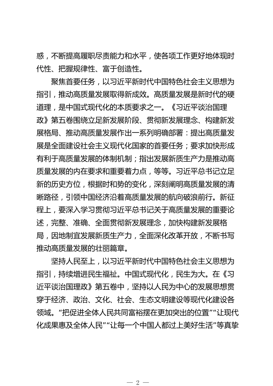 深學(xué)細(xì)悟《總書記談治國(guó)理政》第五卷堅(jiān)持以新思想引領(lǐng)新征程學(xué)習(xí)貫徹《習(xí)近平談治國(guó)理政》第五卷,關(guān)鍵在于學(xué)思用貫通、知信行統(tǒng)一,用習(xí)近平新時(shí)代中國(guó)特色社會(huì)主義思想引領(lǐng)新征程。向著第二個(gè)百年奮斗目標(biāo),向著強(qiáng)國(guó)建設(shè)、民族復(fù)興的光明前景,我國(guó)發(fā)展需要應(yīng)對(duì)的風(fēng)險(xiǎn)和挑戰(zhàn)、需要解決的矛盾和問(wèn)題比以往更加錯(cuò)綜復(fù)雜。要善于從黨的創(chuàng)新理論中找理念、找思路、找方法,不斷提高駕馭復(fù)雜局面、處理復(fù)雜問(wèn)題的能力,在新征程中創(chuàng)造新的偉業(yè)。強(qiáng)化理論武裝,用習(xí)近平新時(shí)代中國(guó)特色社會(huì)主義思想凝“心鑄魂,鑄牢思想根基。科學(xué)理論是推動(dòng)工作、解決問(wèn)題的金”鑰匙。習(xí)近平...