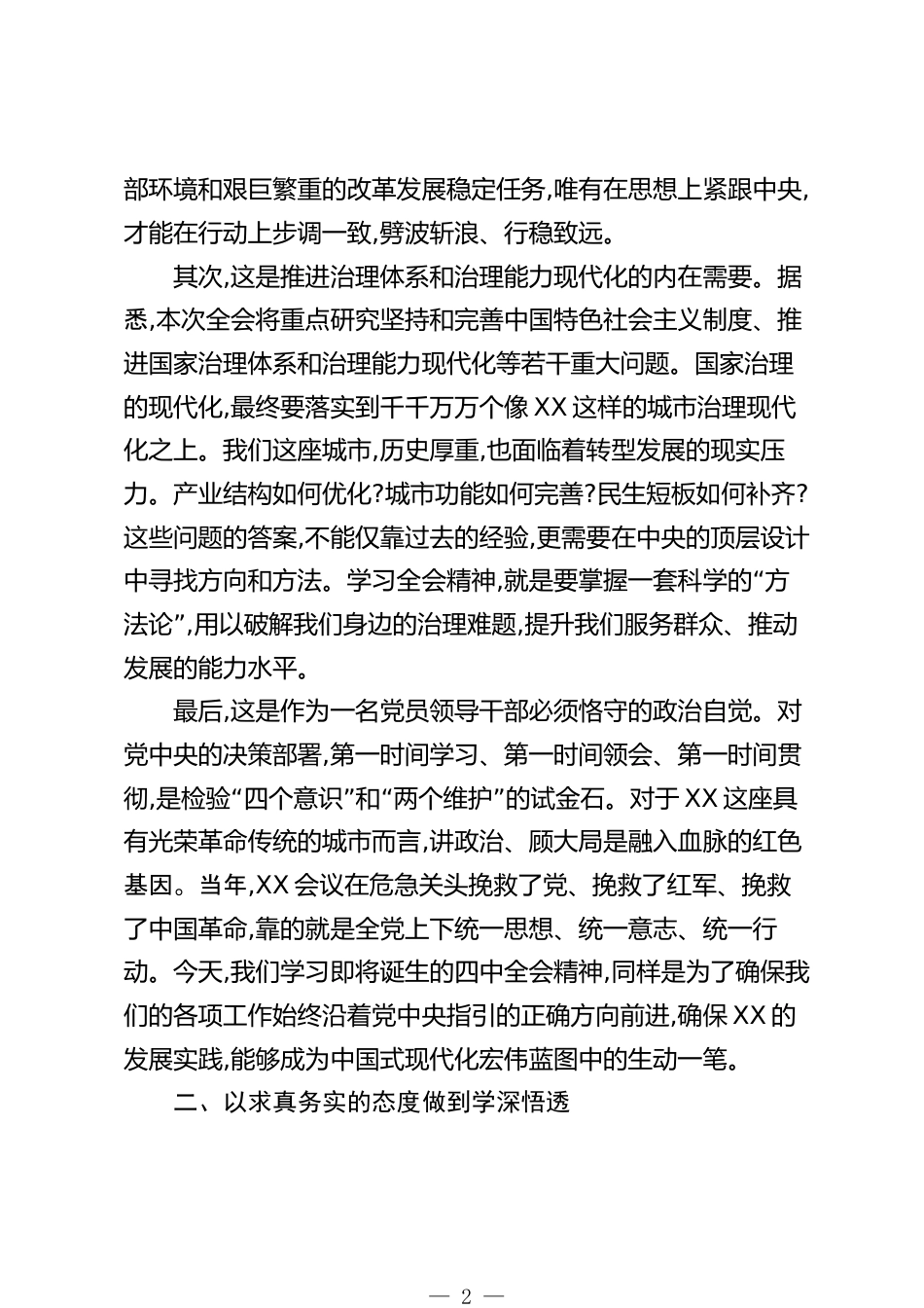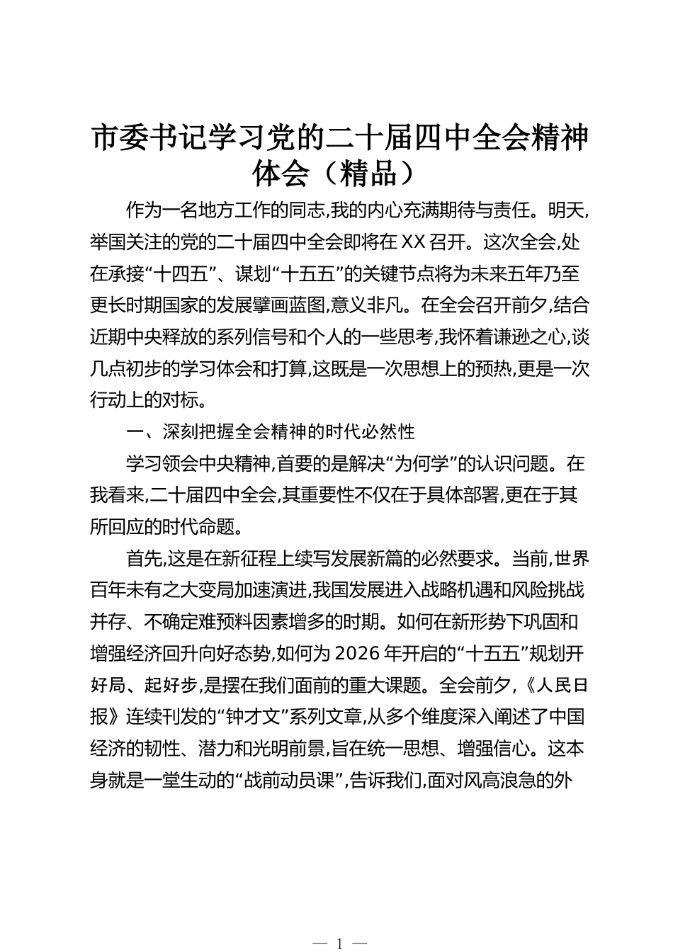 市委書記學(xué)習(xí)黨的二十屆四中全會精神體會(精品)作為一名地方工作的同志,我的內(nèi)心充滿期待與責(zé)任。明天,舉國關(guān)注的黨的二十屆四中全會即將在XX召開。這次全會,處“”“”在承接十四五、謀劃十五五的關(guān)鍵節(jié)點將為未來五年乃至更長時期國家的發(fā)展擘畫藍(lán)圖,意義非凡。在全會召開前夕,結(jié)合近期中央釋放的系列信號和個人的一些思考,我懷著謙遜之心,談幾點初步的學(xué)習(xí)體會和打算,這既是一次思想上的預(yù)熱,更是一次行動上的對標(biāo)。一、深刻把握全會精神的時代必然性學(xué)習(xí)領(lǐng)會中央精神,“”首要的是解決為何學(xué)的認(rèn)識問題。在我看來,二十屆四中全會,其重要性不僅在于具體部署,更在于...