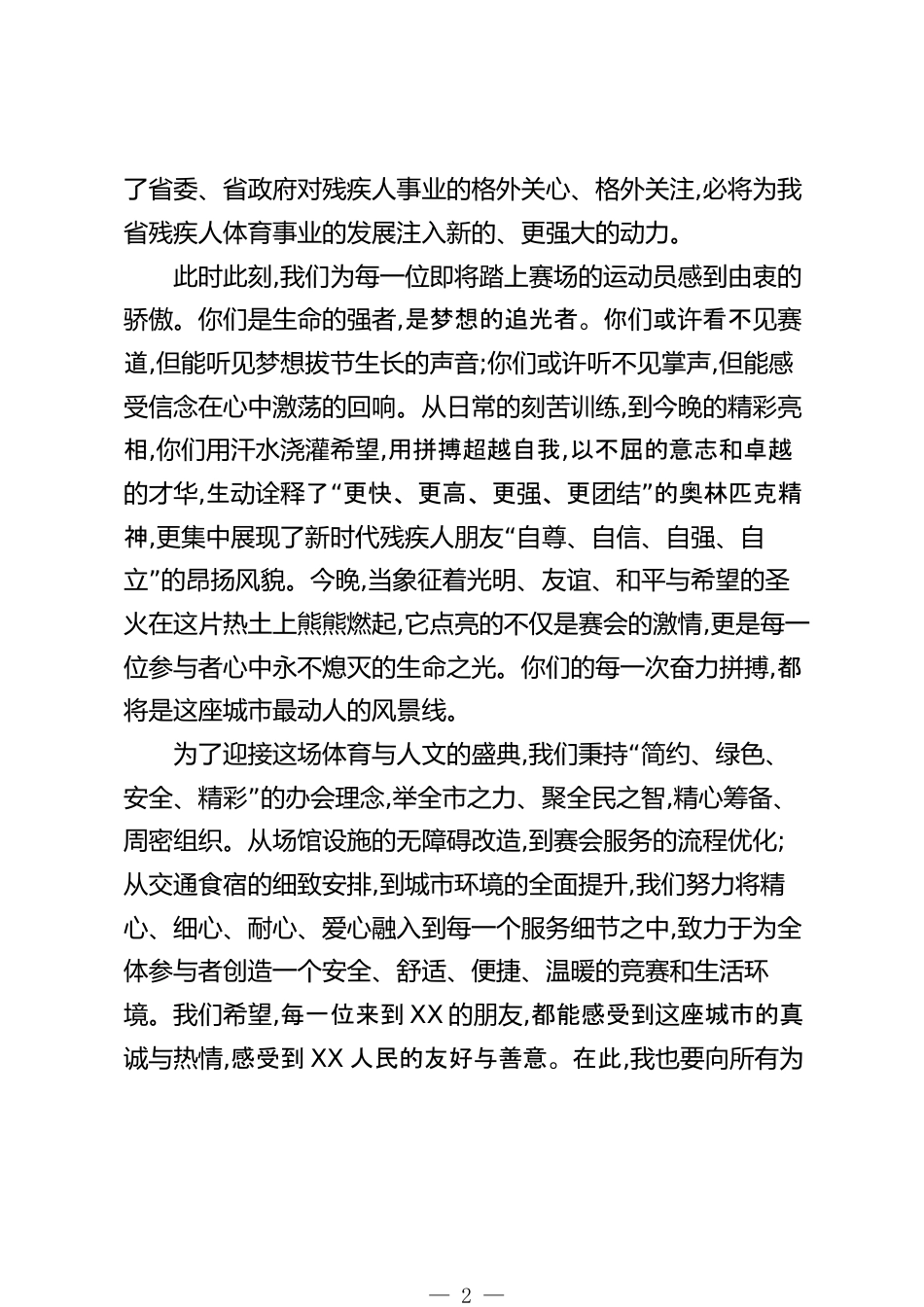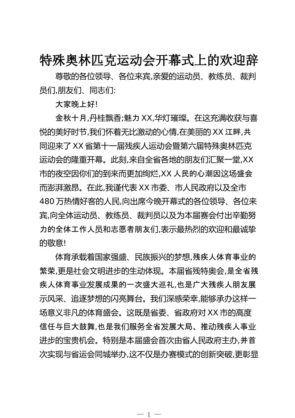 特殊奧林匹克運(yùn)動(dòng)會(huì)開幕式上的歡迎辭尊敬的各位領(lǐng)導(dǎo)、各位來賓,親愛的運(yùn)動(dòng)員、教練員、裁判員們,朋友們、同志們:大家晚上好!金秋十月,丹桂飄香;魅力XX,華燈璀璨。在這充滿收獲與喜悅的美好時(shí)節(jié),我們懷著無比激動(dòng)的心情,在美麗的XX江畔,共同迎來了XX省第十一屆殘疾人運(yùn)動(dòng)會(huì)暨第六屆特殊奧林匹克運(yùn)動(dòng)會(huì)的隆重開幕。此刻,來自全省各地的朋友們匯聚一堂,XX市的夜空因你們的到來而更加絢爛,XX人民的心潮因盛會(huì)這場(chǎng)而澎湃激昂。在此,我謹(jǐn)代表XX市委、市人民政府以及全市480萬熱情好客的人民,向出席今晚開幕式的各位領(lǐng)導(dǎo)、各位來賓,向全體運(yùn)動(dòng)員、教練員、裁判員以及為本屆賽會(huì)...