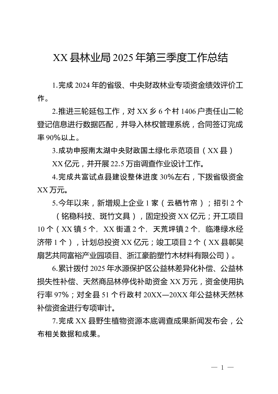 XX縣林業(yè)局2025年第三季度工作總結1.完成2024年的省級、中央財政林業(yè)專項資金績效評價工作。2.推進三輪延包工作,對XX鄉(xiāng)6個村1406戶責任山二輪登記信息進行數據匹配,并導入林權管理系統(tǒng),合同簽訂完成率90%以上。3.成功申南太湖中央政國土化示范目報財綠項(XX縣)XX億元,并開展22.5萬畝調查作業(yè)設計工作。4.完成共富點建整體度試縣設進30%左右,下撥省級資金XX萬元。5.今年以來,新增規(guī)上企業(yè)1家(云棲竹簾);招引2個(銘穩(wěn)科技、斑竹文具),固定投資XX億元;開工項目10個(XX鎮(zhèn)5個,XX街道2個,天荒坪鎮(zhèn)2個,港水臨綠經濟帶1個),計劃總投資XX億元;竣工項目2個(...