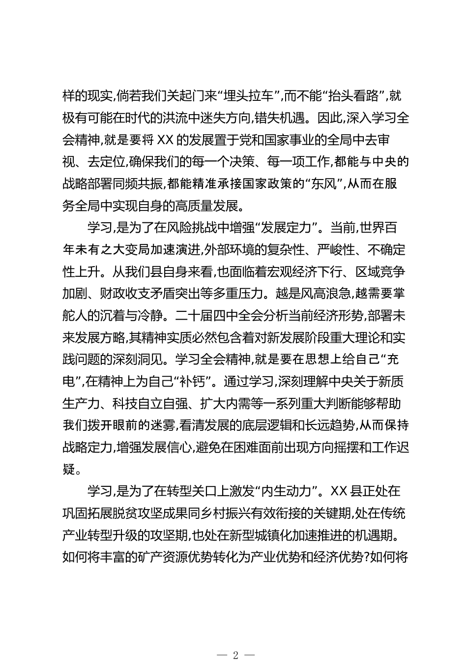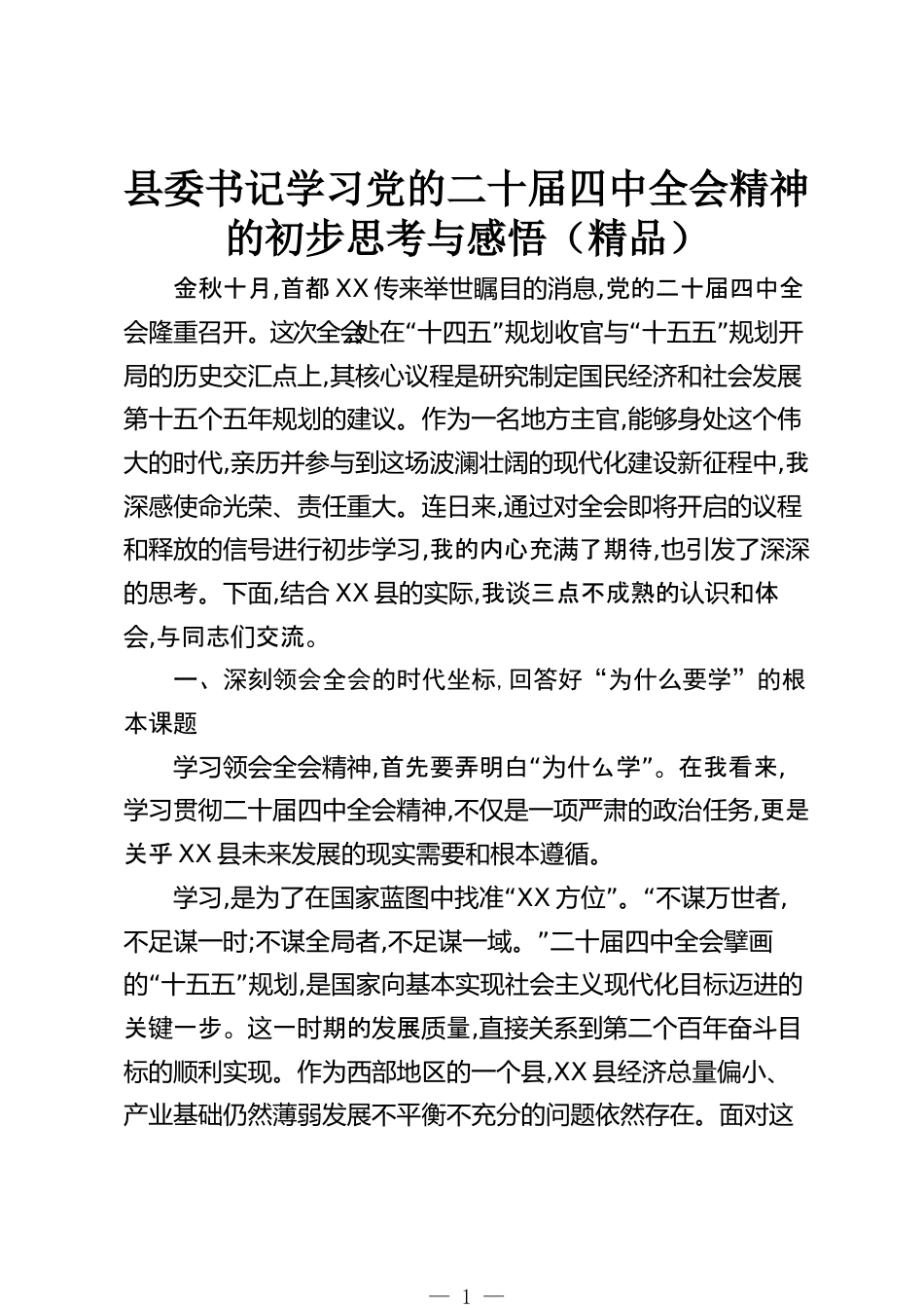 縣委書記學(xué)習(xí)黨的二十屆四中全會(huì)精神的初步思考與感悟(精品)金秋十月,首都XX傳來舉世矚目的消息,黨的二十屆四中全會(huì)隆重召開。這次全會(huì),“”“”處在十四五規(guī)劃收官與十五五規(guī)劃開局的歷史交匯點(diǎn)上,其核心議程是研究制定國民經(jīng)濟(jì)和社會(huì)發(fā)展第十五個(gè)五年規(guī)劃的建議。作為一名地方主官,能夠身處這個(gè)偉大的時(shí)代,親歷并參與到這場波瀾壯闊的現(xiàn)代化建設(shè)新征程中,我深感使命光榮、責(zé)任重大。連日來,通過對(duì)全會(huì)即將開啟的議程和釋放的信號(hào)進(jìn)行初步學(xué)習(xí),我的內(nèi)心充滿了期待,也引發(fā)了深深的思考。下面,結(jié)合XX縣的實(shí)際,我三點(diǎn)不成熟的和體談?wù)J識(shí)會(huì),與同志交流。們一、深刻領(lǐng)會(huì)全...