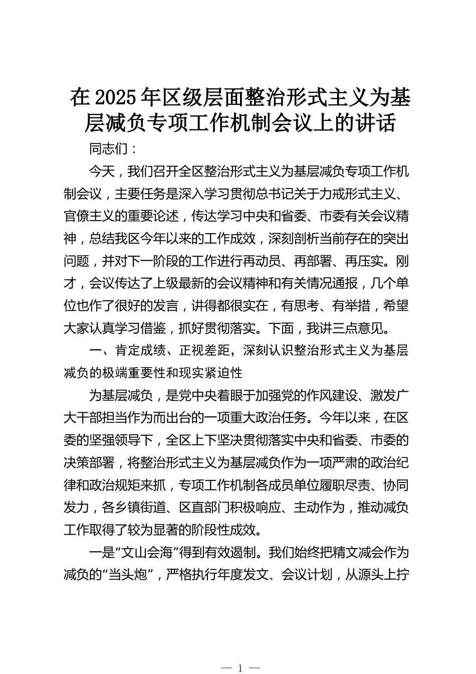 在2025年區(qū)級層面整治形式主義為基層減負專項工作機制會議上的講話