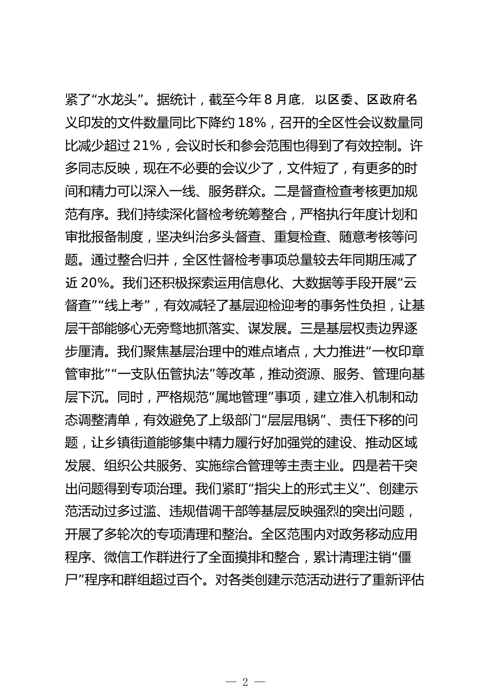 在2025年區(qū)級層面整治形式主義為基層減負專項工作機制會議上的講話同志們:今天,我們召開全區(qū)整治形式主義為基層減負專項工作機制會議,主要任務是深入學習貫徹總書記關于力戒形式主義、官僚主義的重要論述,傳達學習中央和省委、市委有關會議精神,總結我區(qū)今年以來的工作成效,深刻剖析當前存在的突出問題,并對下一階段的工作進行再動員、再部署、再壓實。剛才,會議傳達了上級最新的會議精神和有關情況通報,幾個單位也作了很好的發(fā)言,講得都很實在,有思考、有舉措,希望大家認真學習借鑒,抓好貫徹落實。下面,我講三點意見。一、肯定成績、正視差距,深刻認識整...
