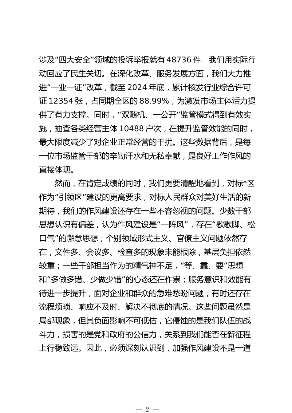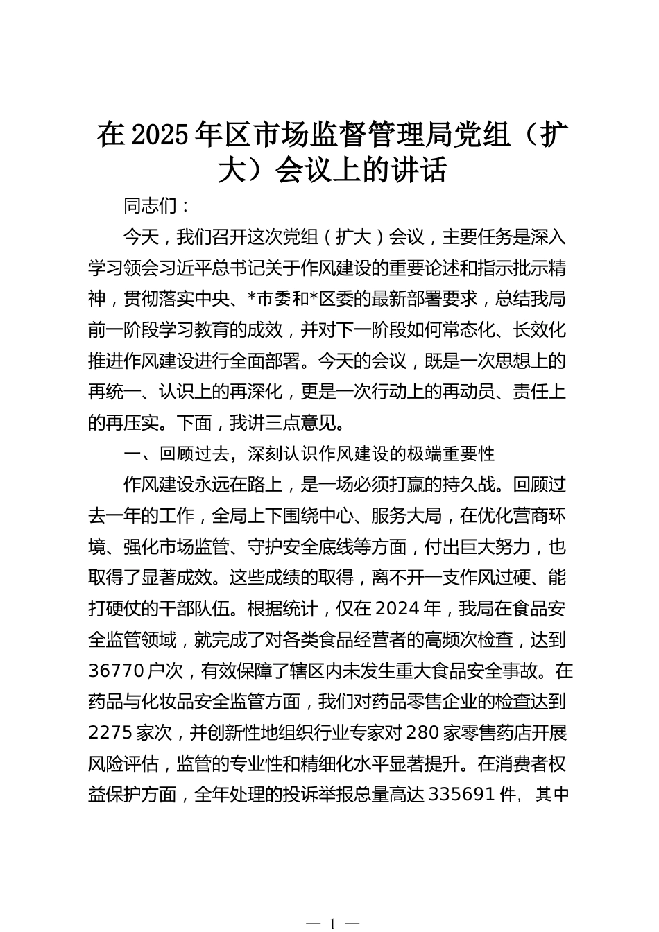 在2025年區(qū)市場(chǎng)監(jiān)督管理局黨組(擴(kuò)大)會(huì)議上的講話同志們:今天,我們召開這次黨組(擴(kuò)大)會(huì)議,主要任務(wù)是深入學(xué)習(xí)領(lǐng)會(huì)習(xí)近平總書記關(guān)于作風(fēng)建設(shè)的重要論述和指示批示精神,貫徹落實(shí)中央、*市委和*區(qū)委的最新部署要求,總結(jié)我局前一階段學(xué)習(xí)教育的成效,并對(duì)下一階段如何常態(tài)化、長(zhǎng)效化推進(jìn)作風(fēng)建設(shè)進(jìn)行全面部署。今天的會(huì)議,既是一次思想上的再統(tǒng)一、認(rèn)識(shí)上的再深化,更是一次行動(dòng)上的再動(dòng)員、責(zé)任上的再壓實(shí)。下面,我講三點(diǎn)意見。一、回顧過去,深刻認(rèn)識(shí)作風(fēng)建設(shè)的極端重要性作風(fēng)建設(shè)永遠(yuǎn)在路上,是一場(chǎng)必須打贏的持久戰(zhàn)?;仡欉^去一年的工作,全局上下圍繞中心、...