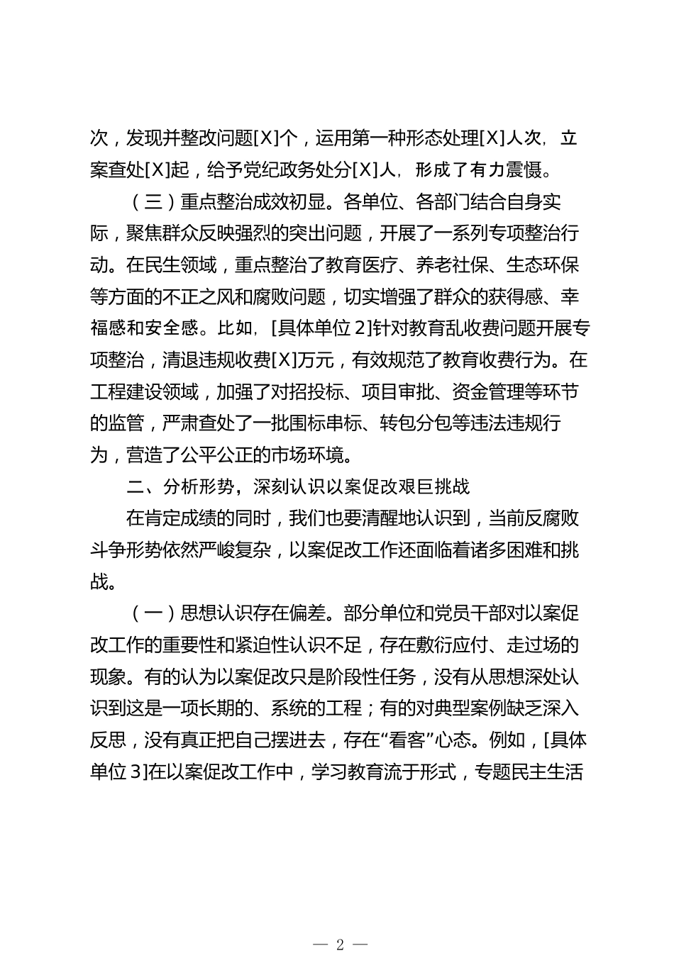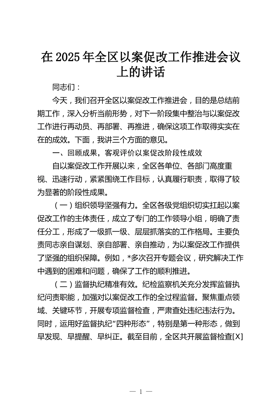 在2025年全區(qū)以案促改工作推進(jìn)會(huì)議上的講話同志們:今天,我們召開(kāi)全區(qū)以案促改工作推進(jìn)會(huì),目的是總結(jié)前期工作,深入分析當(dāng)前形勢(shì),對(duì)下一階段集中整治與以案促改工作進(jìn)行再動(dòng)員、再部署、再推進(jìn),確保這項(xiàng)工作取得實(shí)實(shí)在在的成效。下面,我講三個(gè)方面的意見(jiàn)。一、回顧成果,客觀評(píng)價(jià)以案促改階段性成效自以案促改工作開(kāi)展以來(lái),全區(qū)各單位、各部門高度重視、迅速行動(dòng),緊緊圍繞工作目標(biāo),認(rèn)真履行職責(zé),取得了較為顯著的階段性成果。(一)組織領(lǐng)導(dǎo)堅(jiān)強(qiáng)有力。全區(qū)各級(jí)黨組織切實(shí)扛起以案促改工作的主體責(zé)任,成立了專門的工作領(lǐng)導(dǎo)小組,明確了責(zé)任分工,形成了一級(jí)抓一...